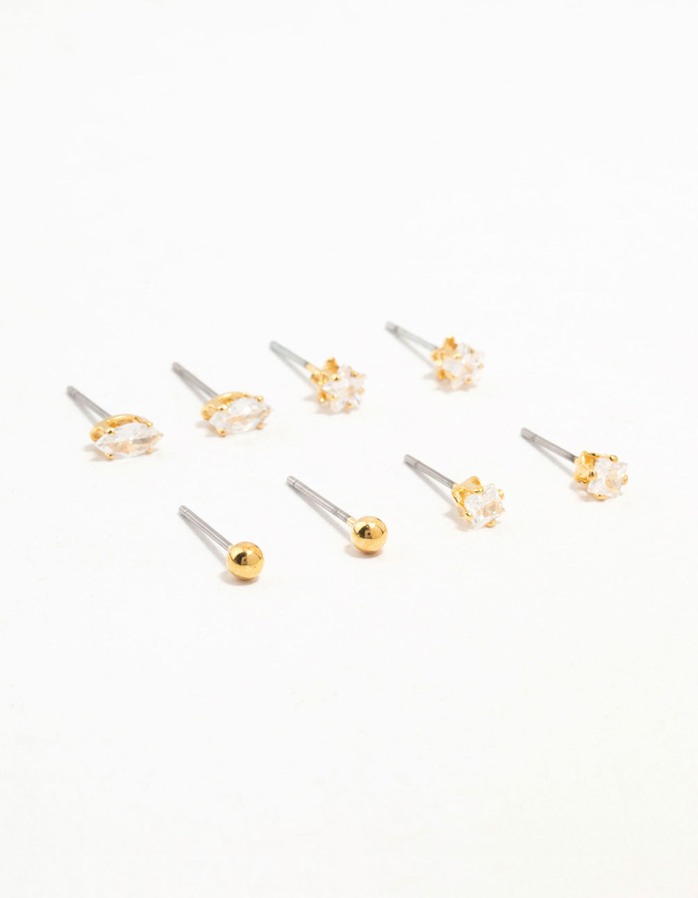 Gold Plated Brass Star & Marquise Cubic Zirconia Earrings 4-Pack