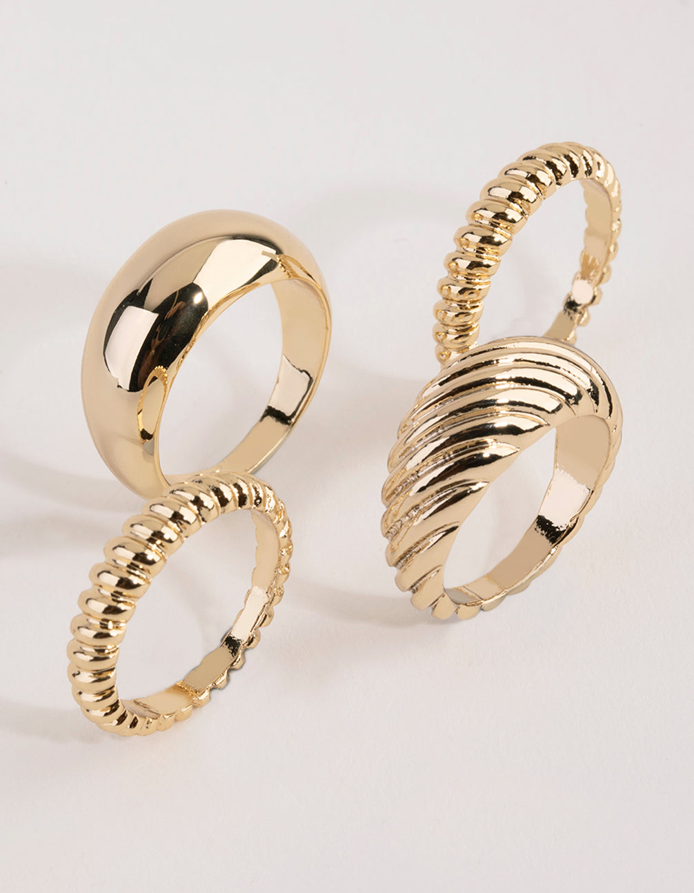 Featuring a chic, twisted design similar to the iconic pastry, our Croissant Collection is the perfect blend of modern and classic styling! This ring set features four rings: three of which boast a twisted croissant design in varying sizes. A plain band rounds out the set of four. Each is plated with genuine gold for authentic lustre and shine. Wear them on their own or layer them with other gold pieces for a curated look.