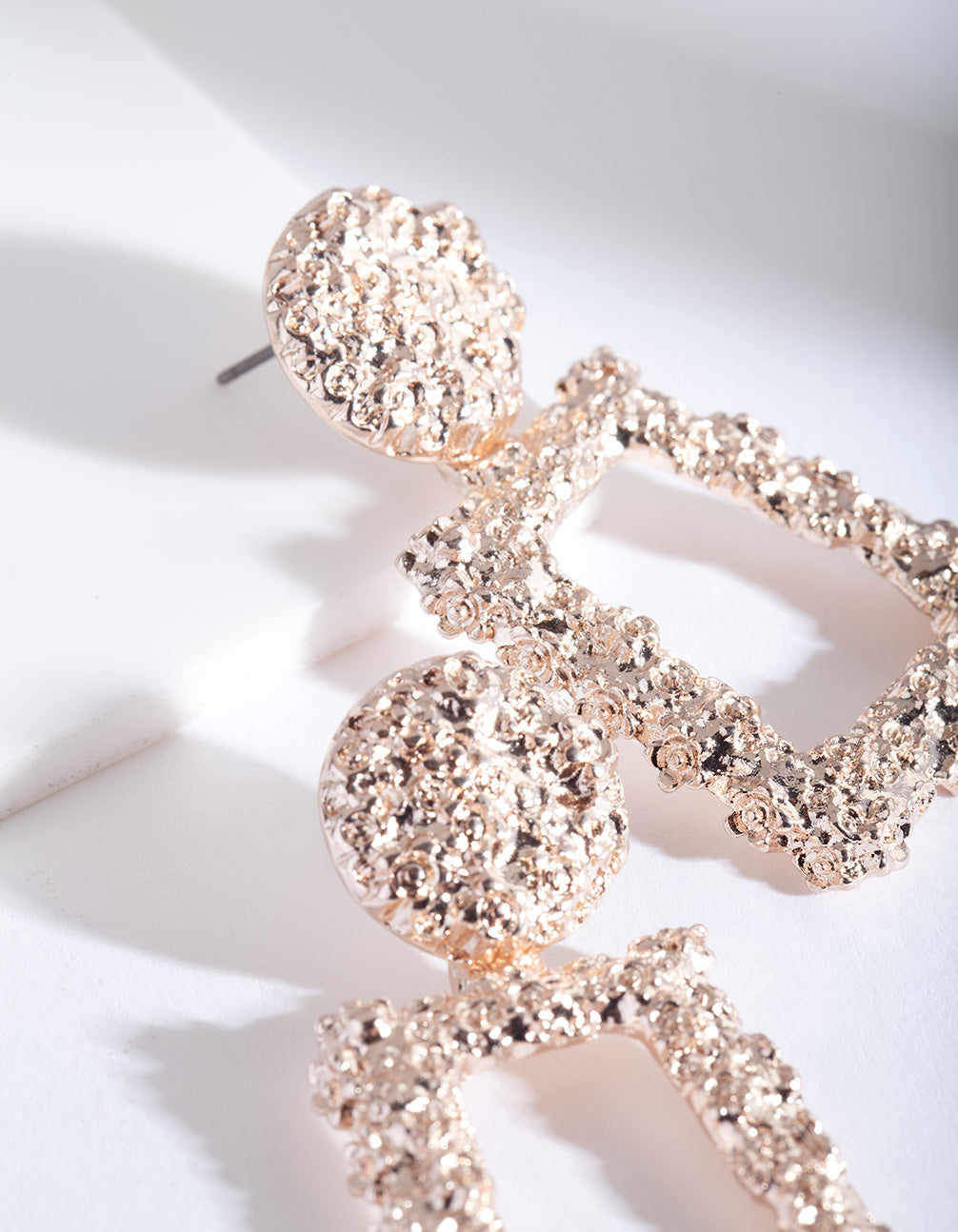 A fun pair of fashion earrings are an easy way to spice up your daily ensembles! These rose-gold-toned earrings feature a textured geometric design.