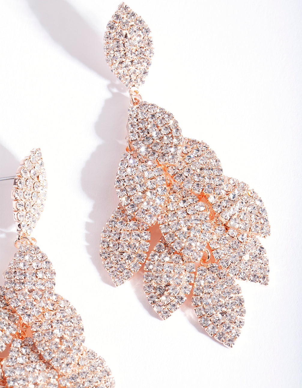Elevate your look with a stunning statement earring. This earring boasts a drop design with diamante embellished multi leaf detailing in a rose gold-tone setting.