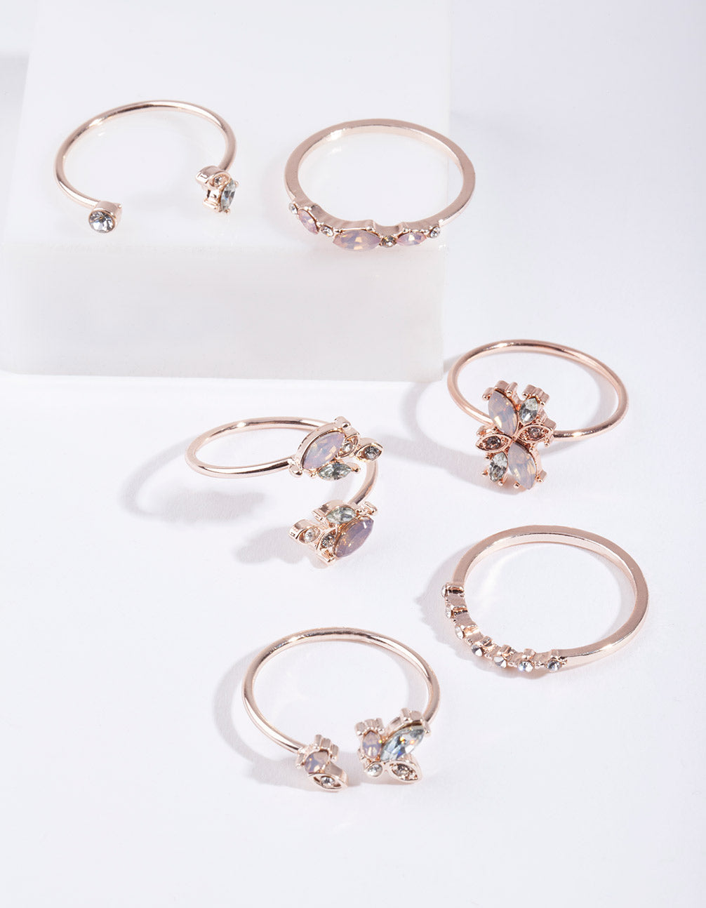 Ring stacking is a major trend. Ring packs allow you to mix and match to customise your look. This style features a rose-gold-toned gem embellished design.
