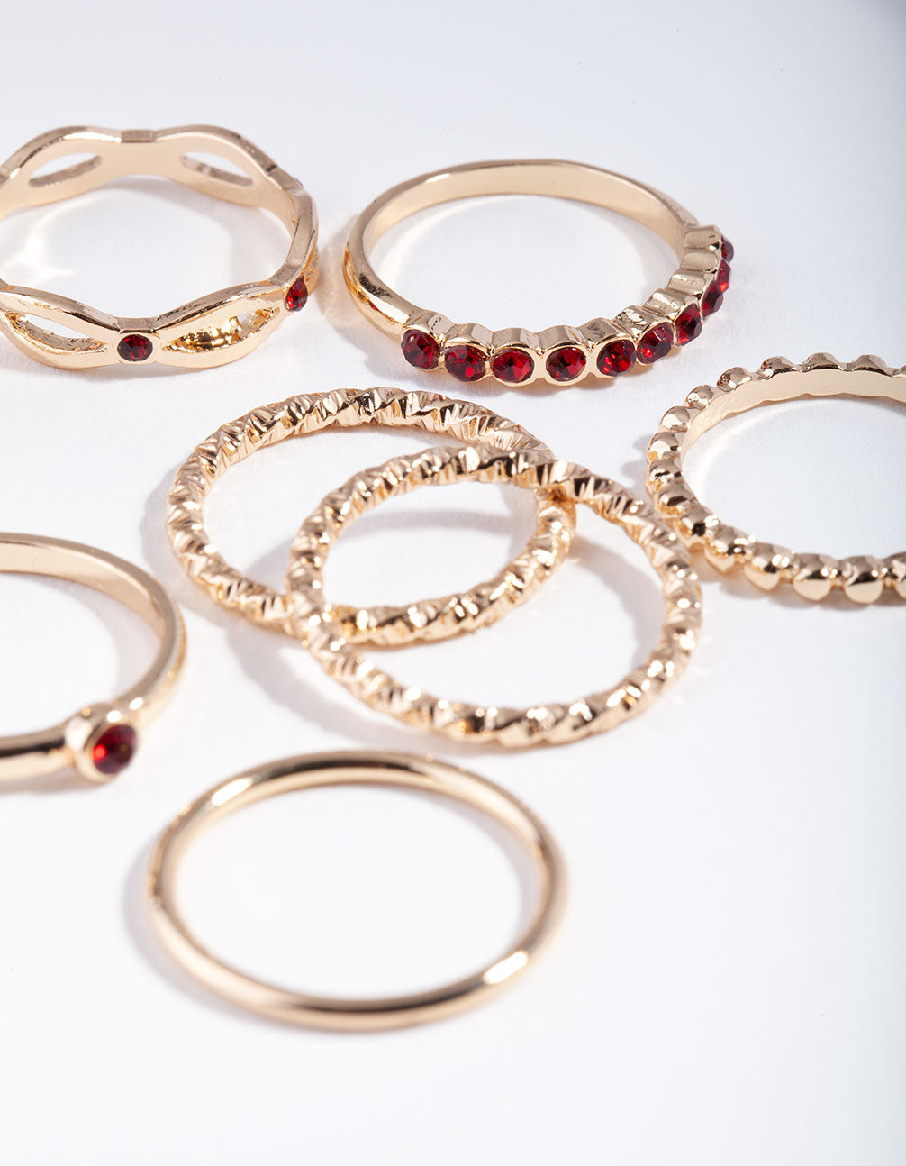 Add some texture to your look with this gold-toned ring stack. This pack also comes with red stone embellishments for an extra pop of colour.
