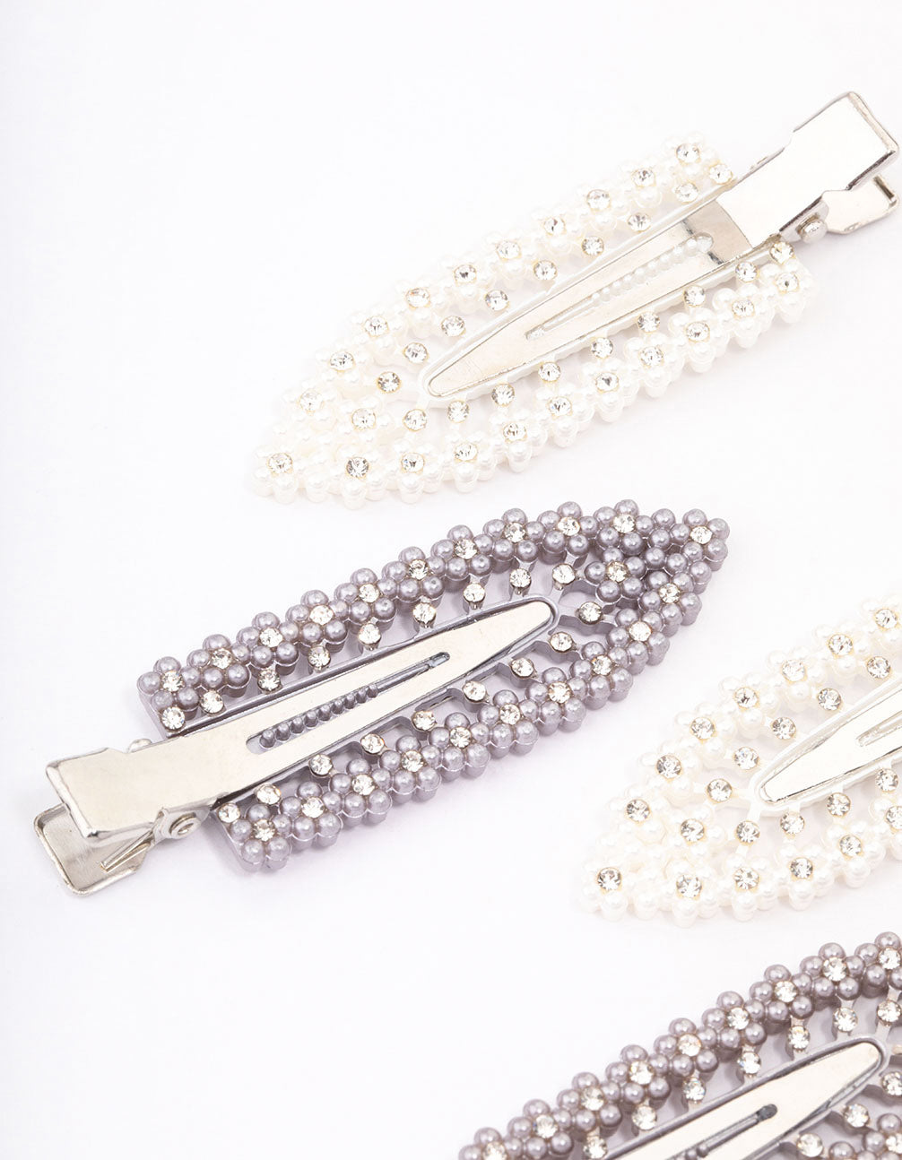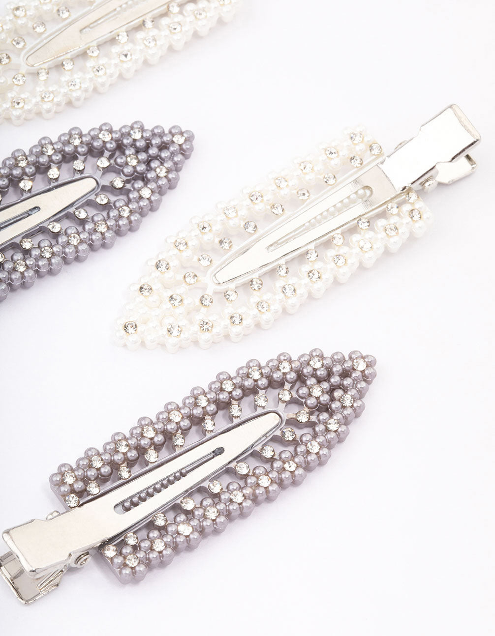 - This hair accessory pack contains four individual hair clips, designed with gunmetal and pearly white beads for a monochromatic finish to your look.