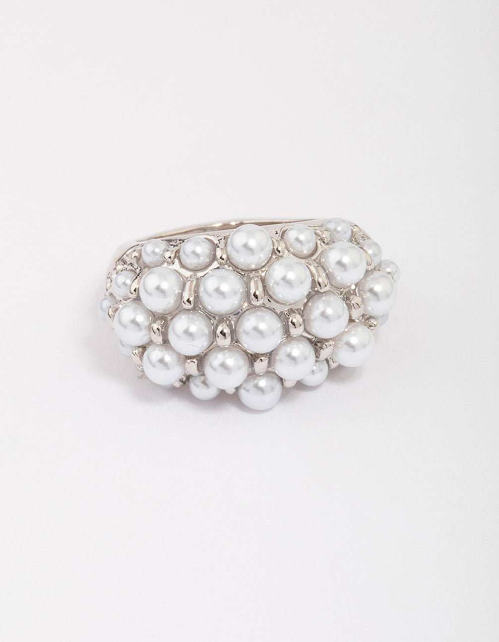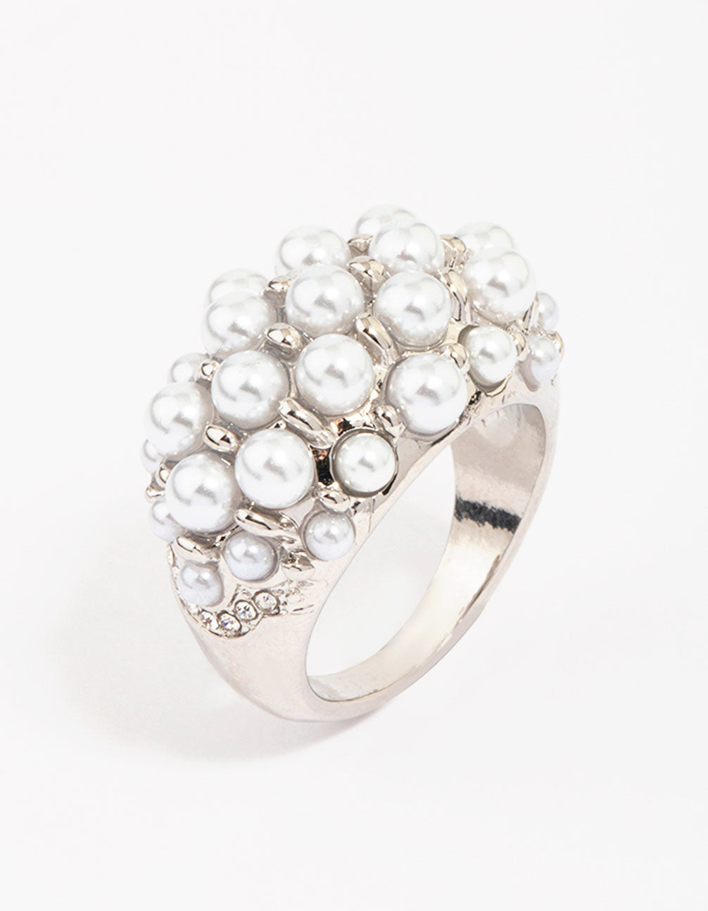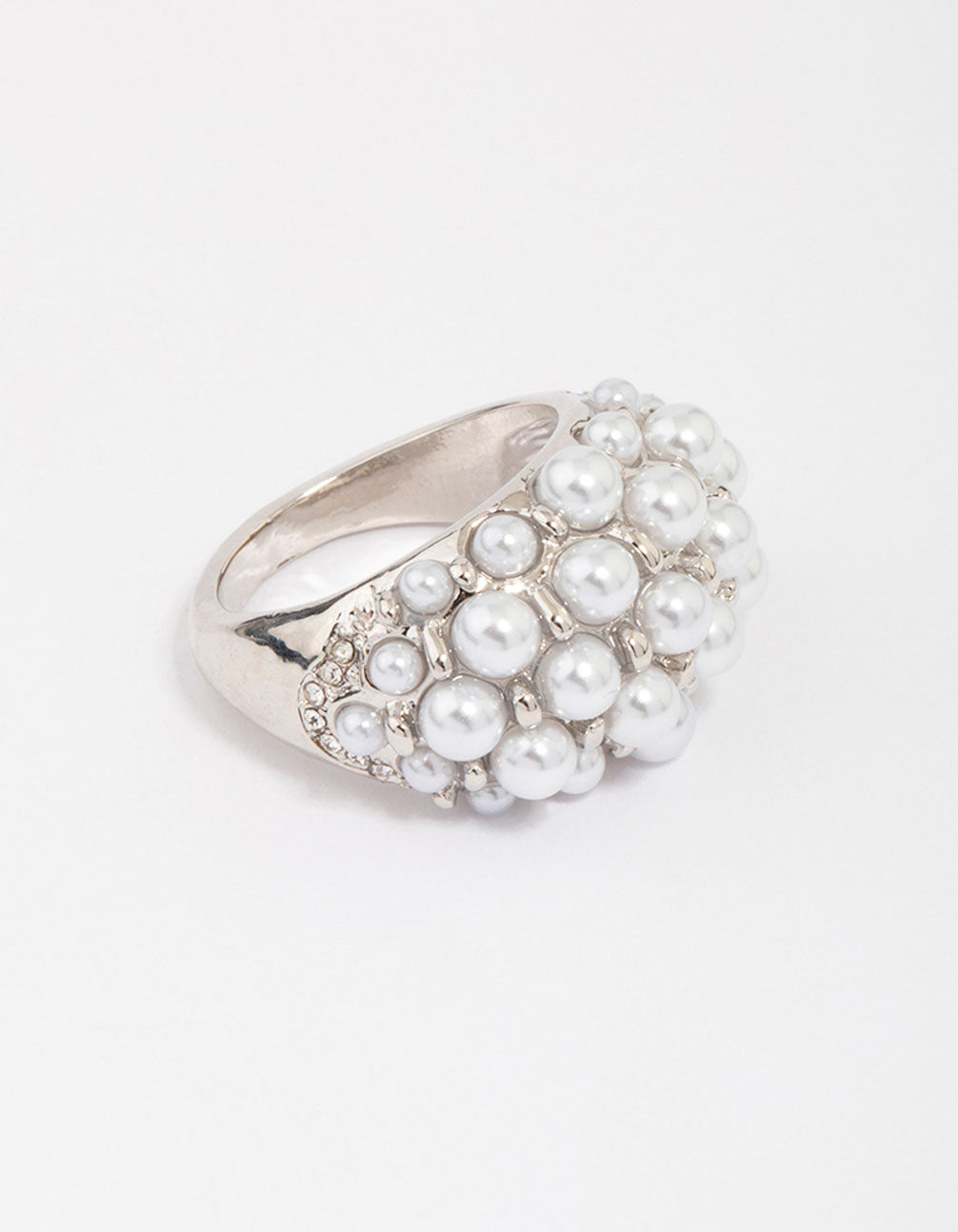 For an embellished finish to your ring stack, style this silver-toned cocktail ring. This modern statement ring features a dome-shaped silhouette, adorned with miniature crystals and dotted with pearls for a touch of elegance.