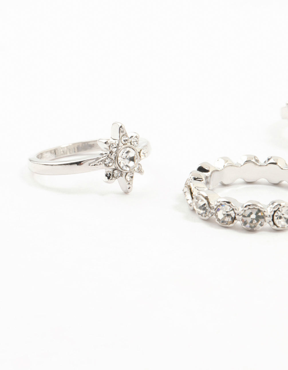 Stack up in style with this chic 5-pack of silver rings adorned with sparkling diamantes. Mix and match for endless personal flair, whether worn solo or layered for a high-impact look. Elevate your everyday outfits with this sophisticated, glam set.