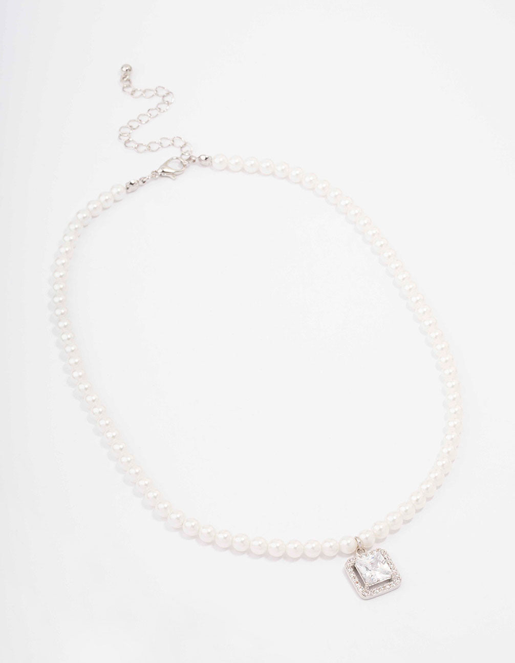 This timeless pendant necklace features a string of pearls, adorned with a square, solitaire pendant for a sophisticated finish.