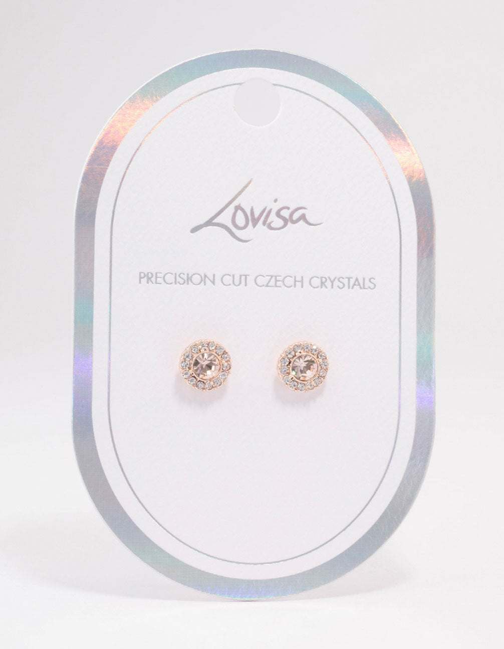 These elegant studs feature a halo-inspired design adorned with blush-coloured czech crystals for a touch of sparkle.