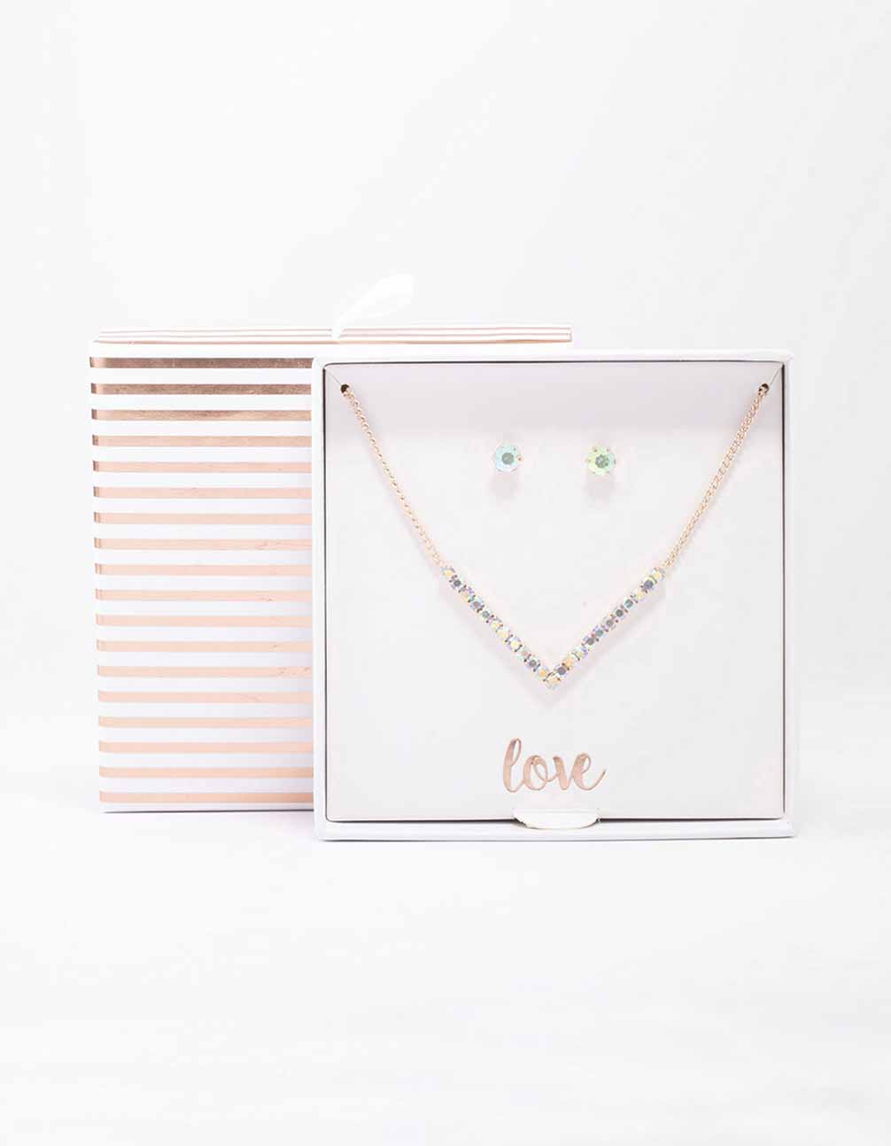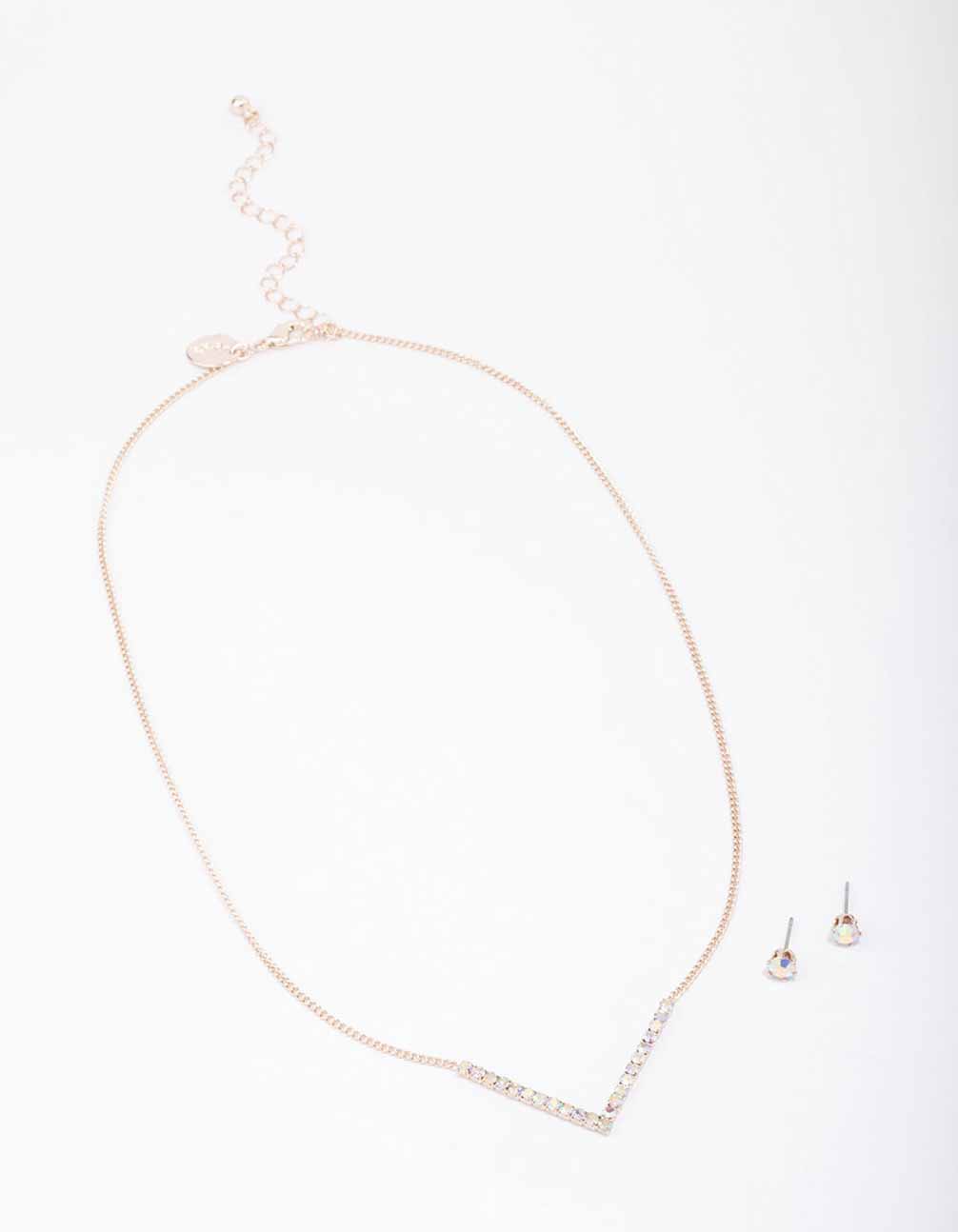 Rose Gold Cubic Zirconia V-Shaped Necklace & Stud Earring Set