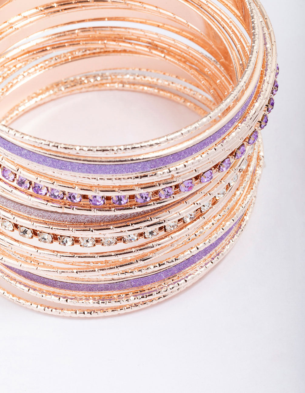 Curate your wrist stack with this set of gorgeous, rose gold bracelets. This bracelet stack contains a mix of fine bangles, encrusted with lilac-coloured diamantes for a hint of glamour and colour.