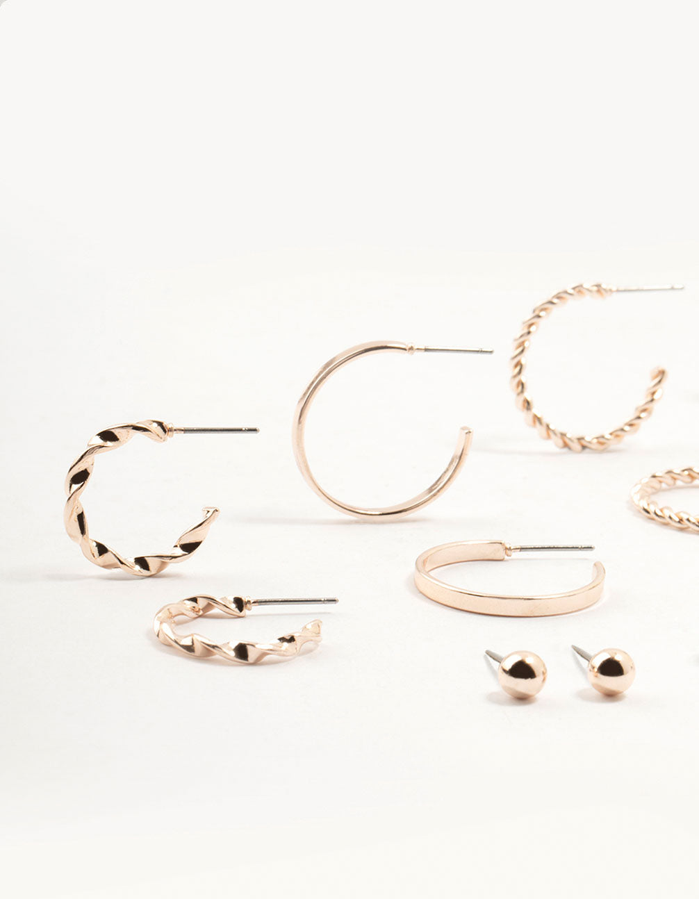 Create the ultimate ear stack with this set of 8 sleek earrings. Featuring twisted hoops, smooth designs, and sparkly diamante and pearl studs in a lovely rosy tone, these versatile pieces are perfect for stacking or wearing solo with any outfit.