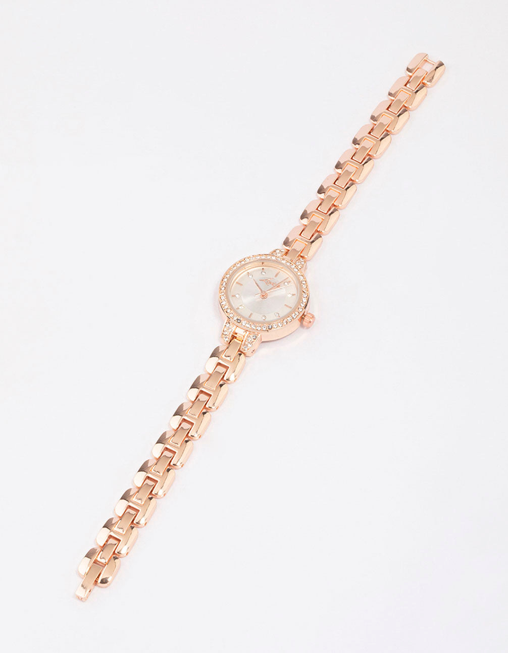 This watch features a rose gold setting adorned with delicate diamantes for a touch of glamour. Pair this watch with matching bracelets for a personalised touch.
