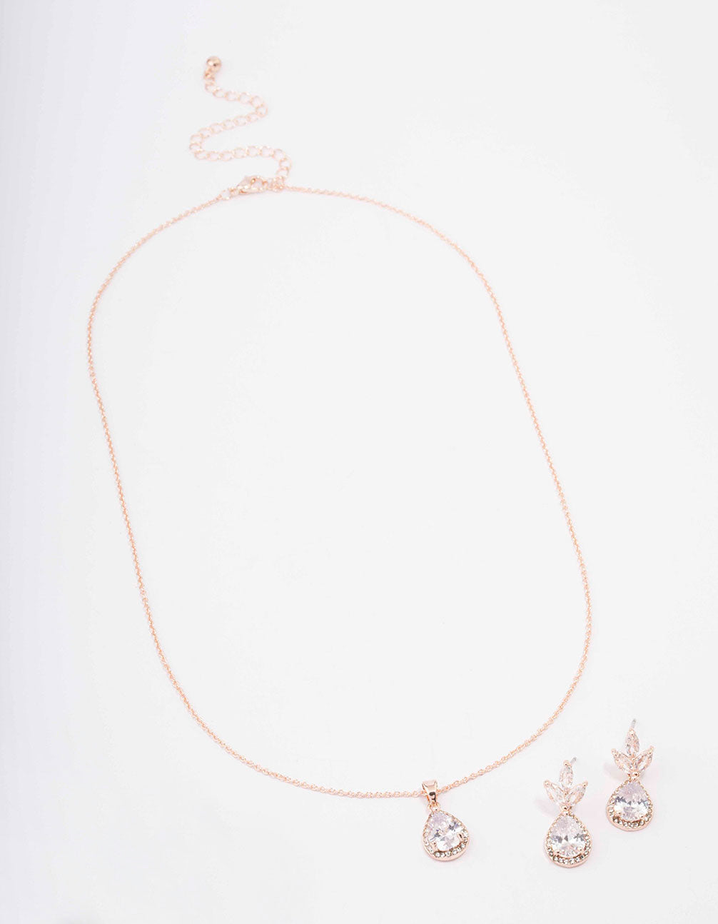 Rose Gold Leaf Pear Halo Necklace & Drop Earring Set