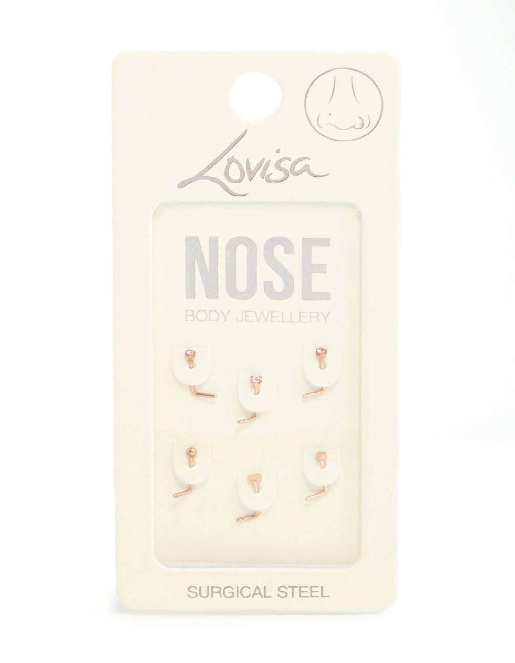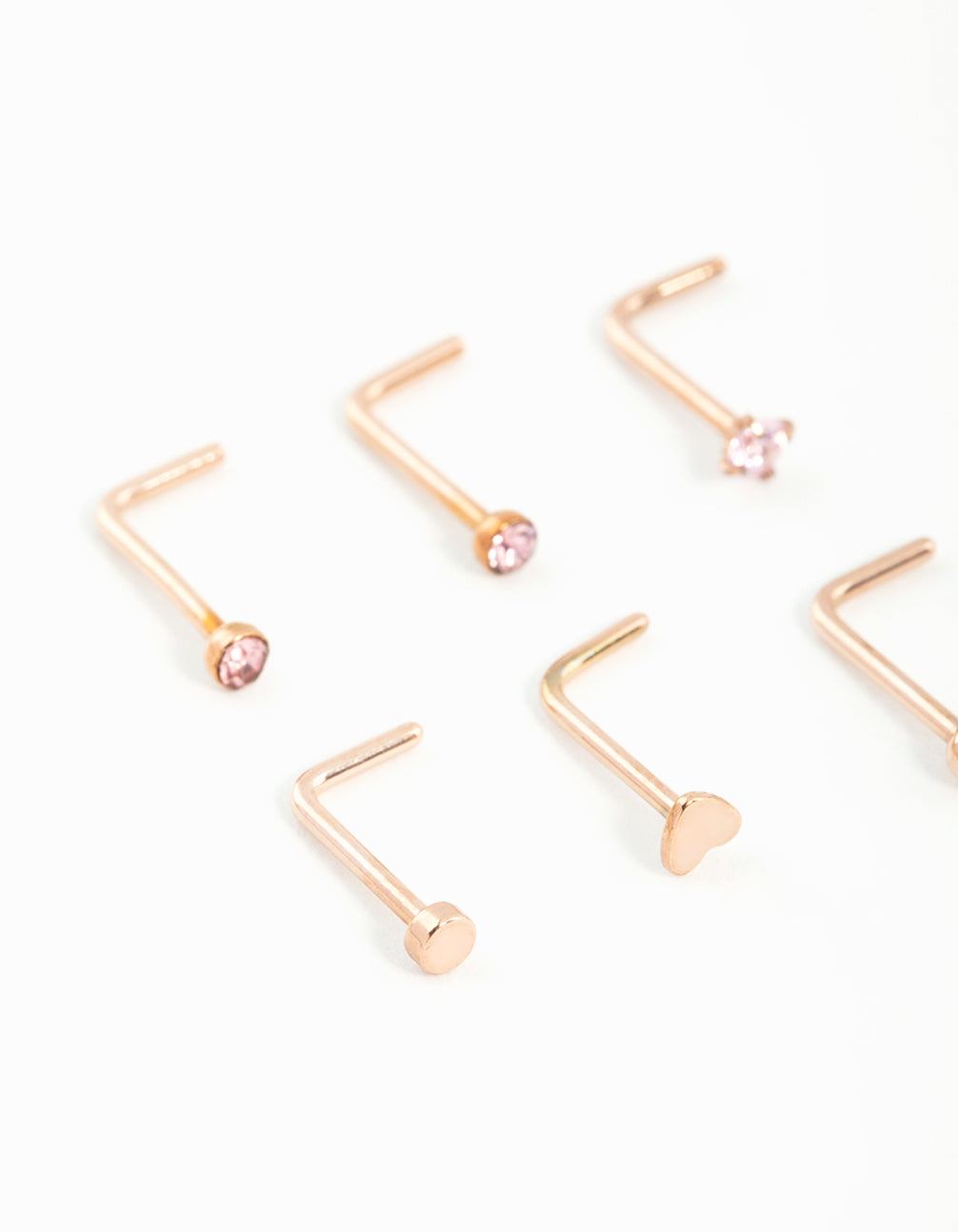 Rose Gold Plated Surgical Steel Heart & Diamante Nose Studs 6-Pack
