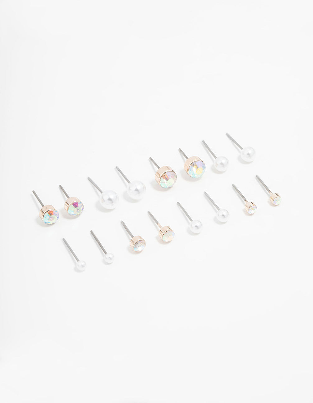 Rose Gold Round Pearl & Aurora Borealis Diamante Stud Earrings 8-Pack Rose Gold Round Pearl & Aurora Borealis Diamante Stud Earrings 8-Pack Rose Gold Round Pearl & Aurora Borealis Diamante Stud Earrings 8-Pack