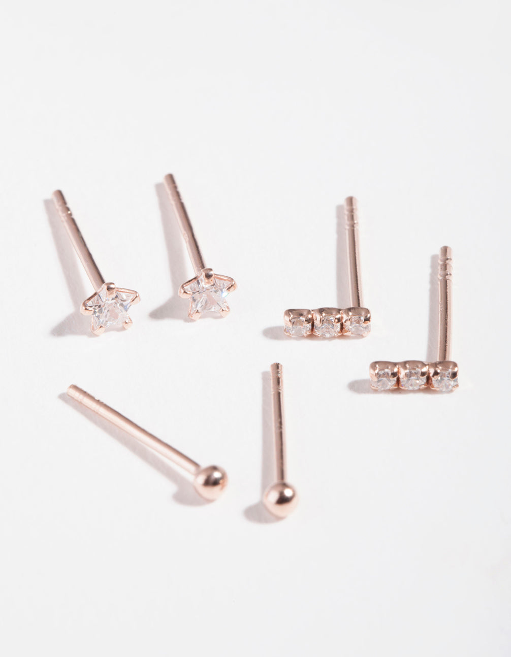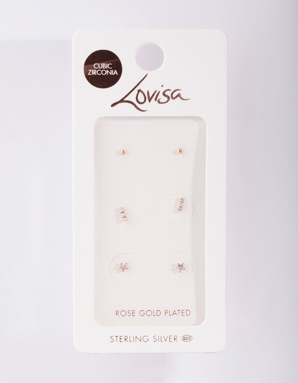 This style is perfect for those who have multiple piercings and want to achieve a fashion-forward look! This rose-gold plated sterling silver earring 3 pack features cubic zirconia stone, line and ball designs. Whether your creating an ear stack or just like to mix and match, this style is a subtle yet glamorous feature to your outfit!