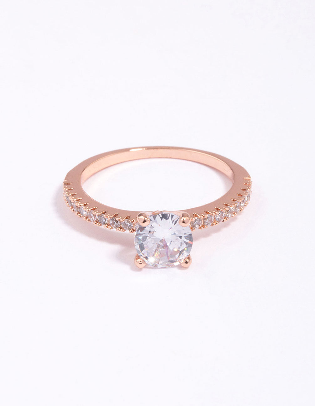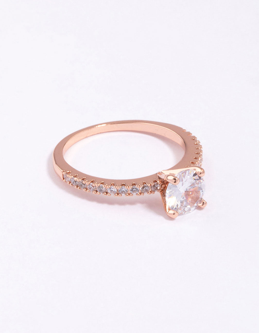 This rose gold plated ring features a round, textured band with a simple engagement-style stone in the centre.
