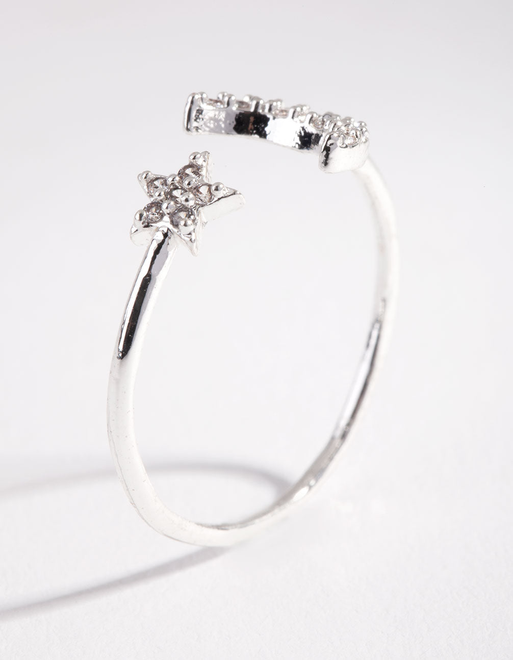 Add some sparkle to your everyday styling with this ring. This ring features a stunning cubic zirconia embellished moon and star open ring design in a silver-toned setting.