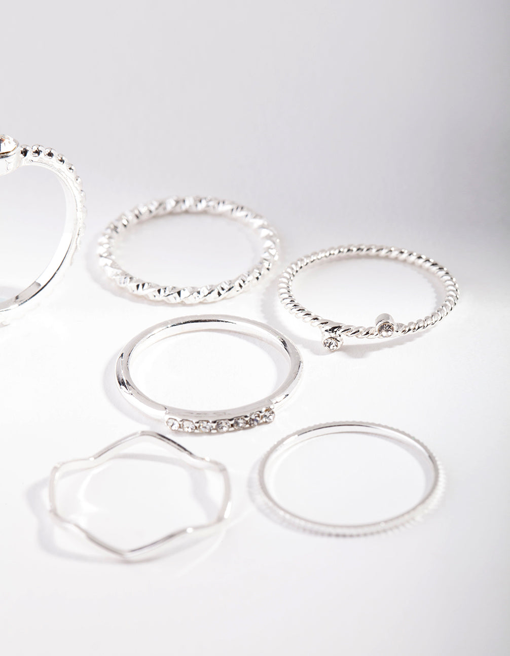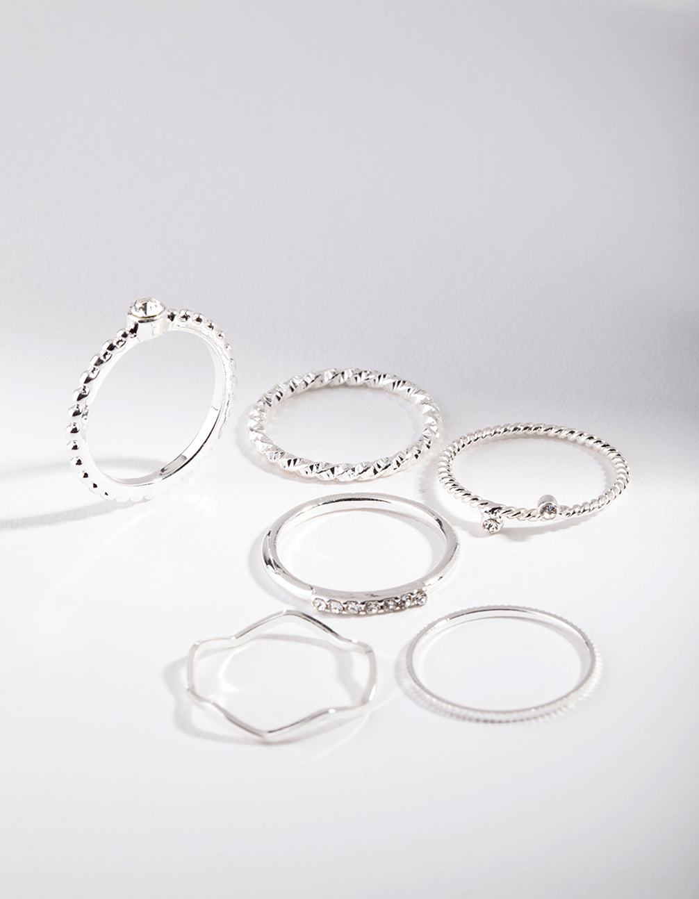 Mix and match with our ring packs! Stackable rings allow you to create your own personalised looks. This pack comes with a variety of silver-toned styles featuring stunning diamante embellished band designs.