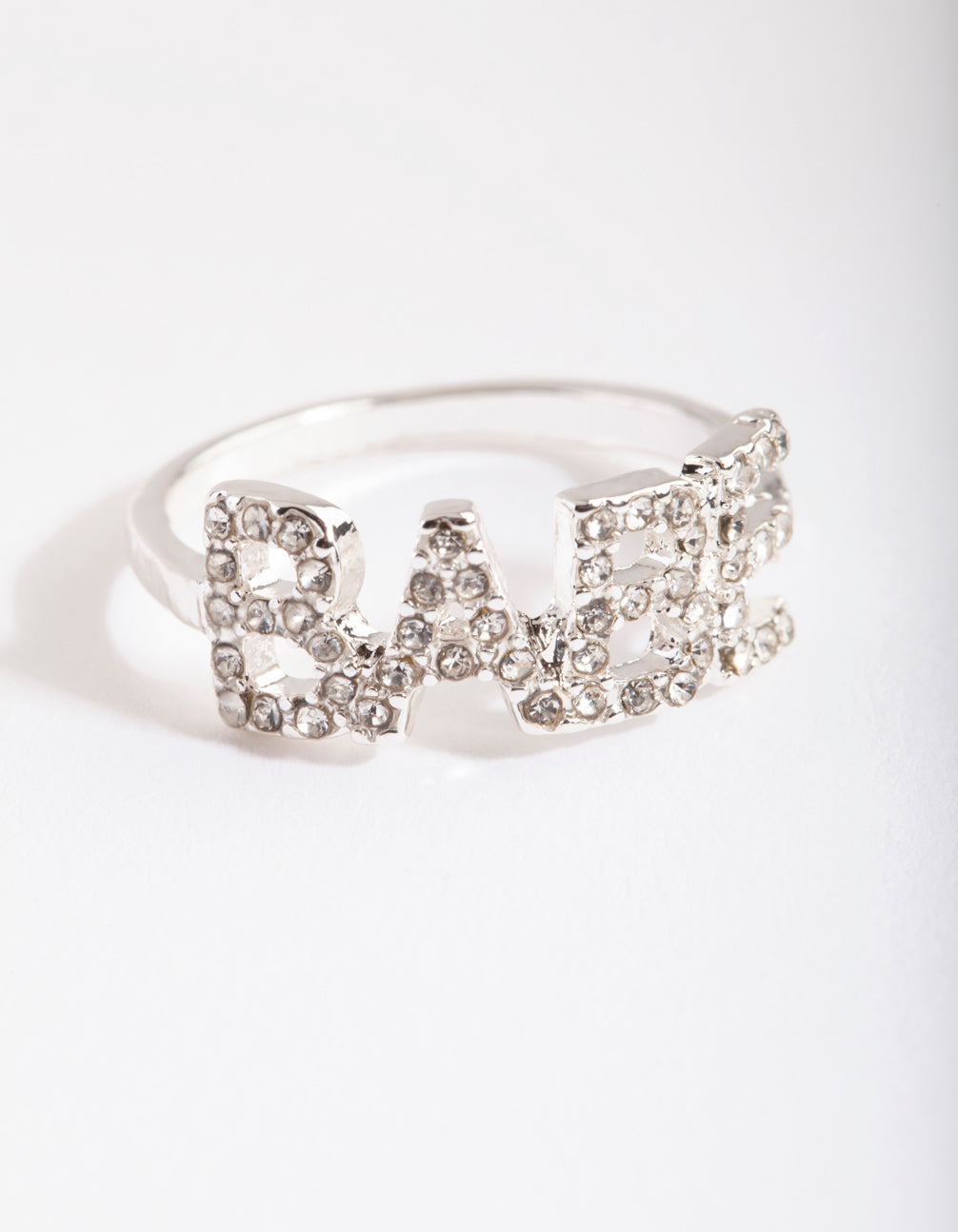Make a statement in a stunning fashion ring. Stack with other styles for extra impact or wear alone for a refined addition to your ensemble. This ring features a silver toned setting with the word "babe" written in diamantes.