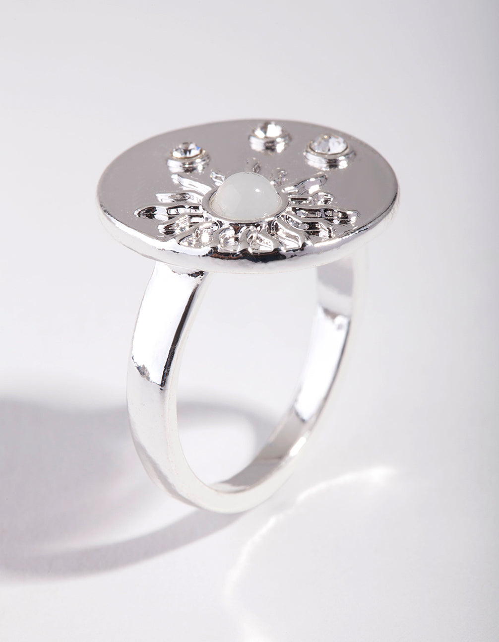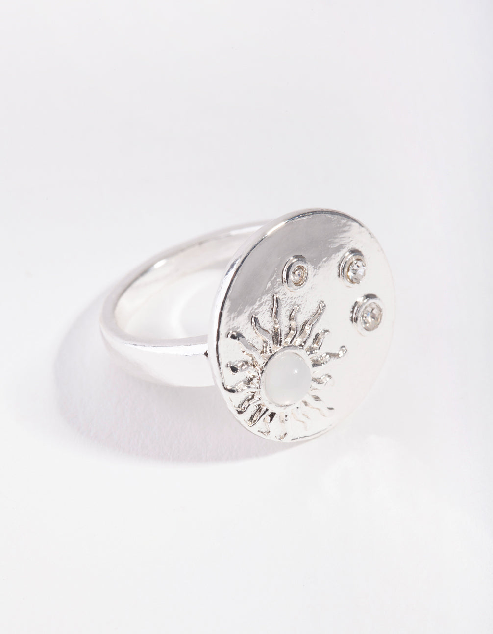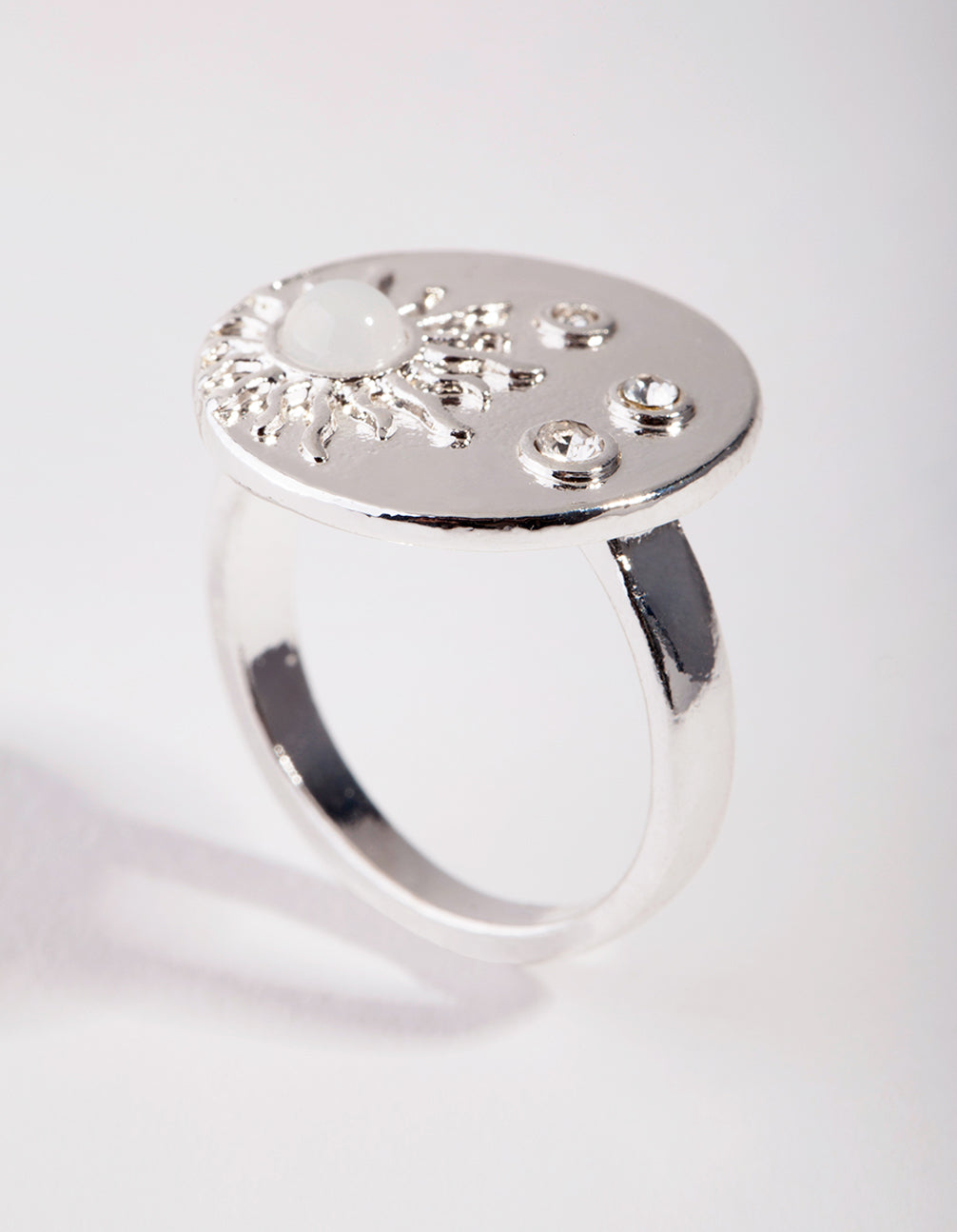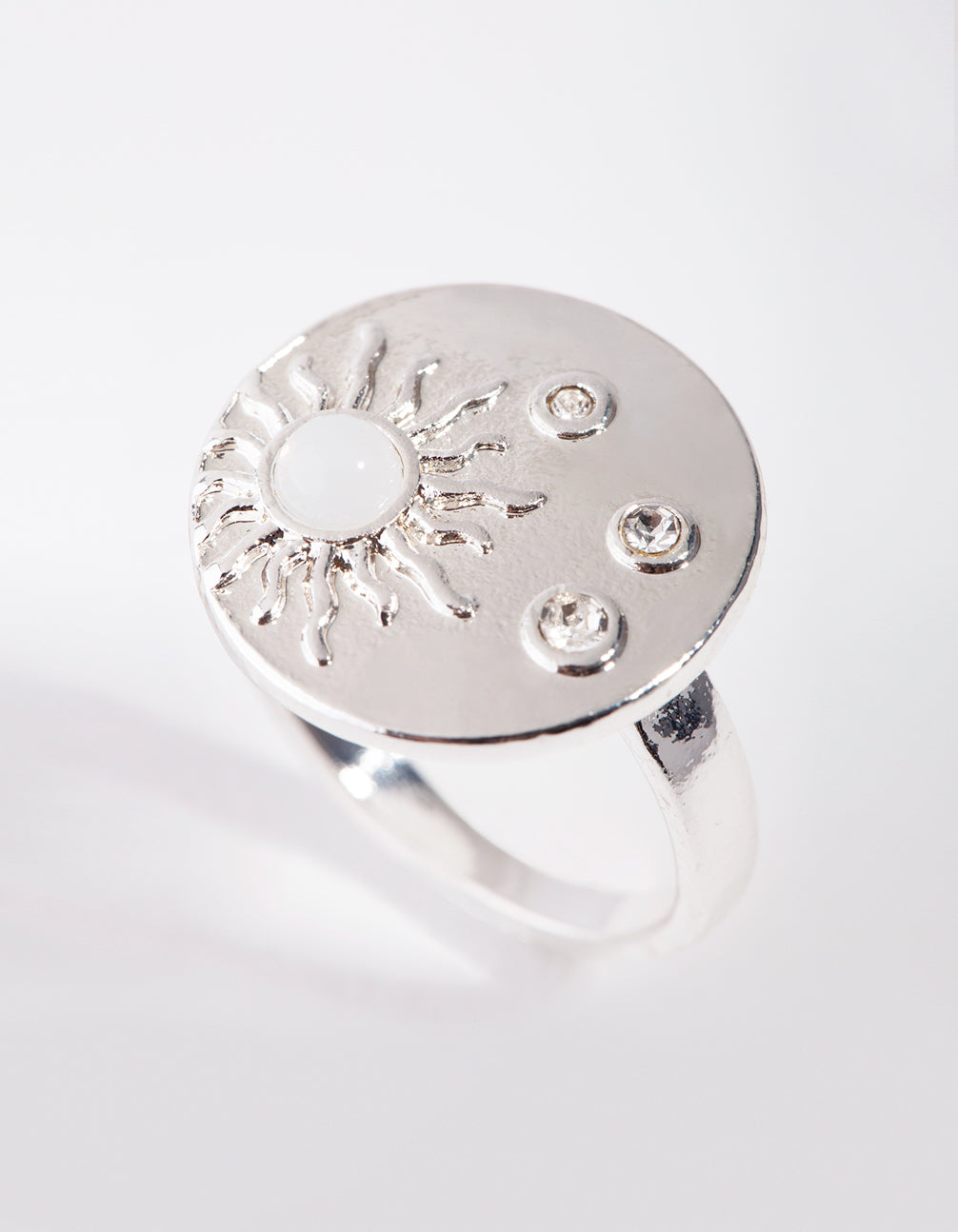 Pay homage to another time with vintage-inspired rings. This lovely silver-toned ring has a far out celestial vibe. It features a sun design with a milky centre and little shining diamantes. Stack it with other celestial-inspired designs for an eclectic 70s look.