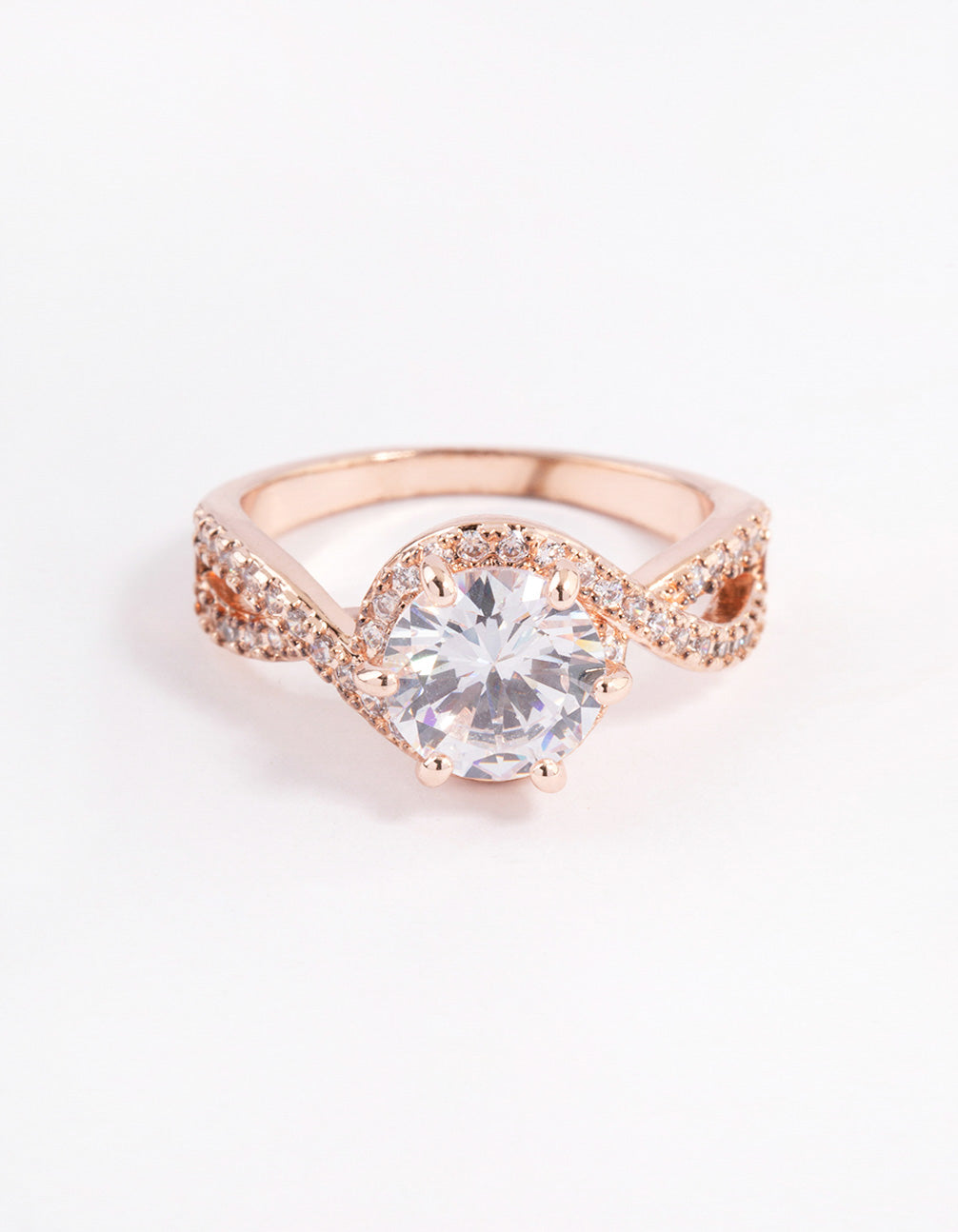 Add some warmth to your look with our collection of rose gold pieces! This timeless ring features an infinity silhouette with a shining, cubic zirconia stone in the centre!