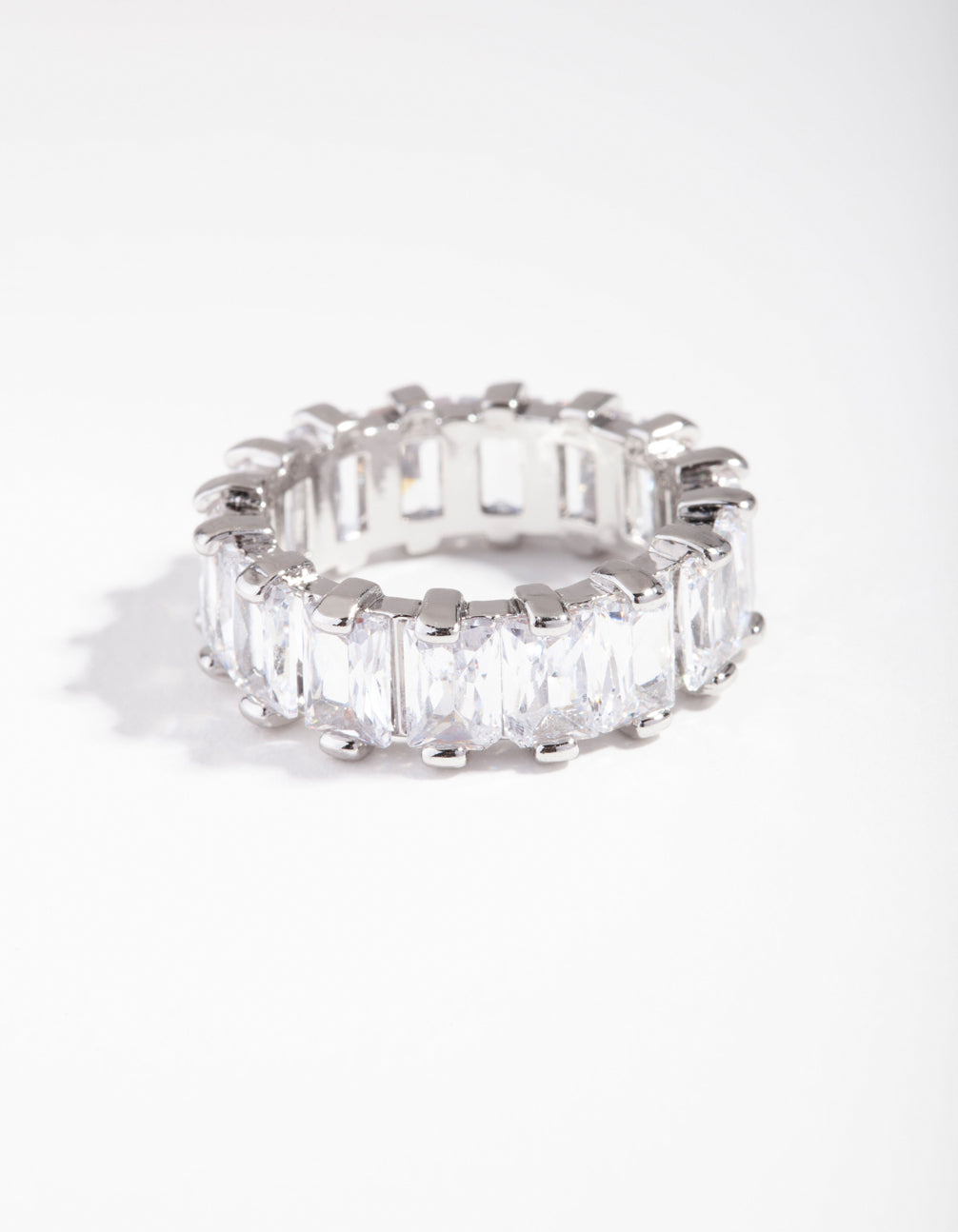 Add some luxury to your look with rings featuring cubic zirconia stones, which sparkle with the clarity and brilliance of a true diamond. This silver-toned ring features a stylish rectangular-cut stone design. Enjoy a ring with some bling!