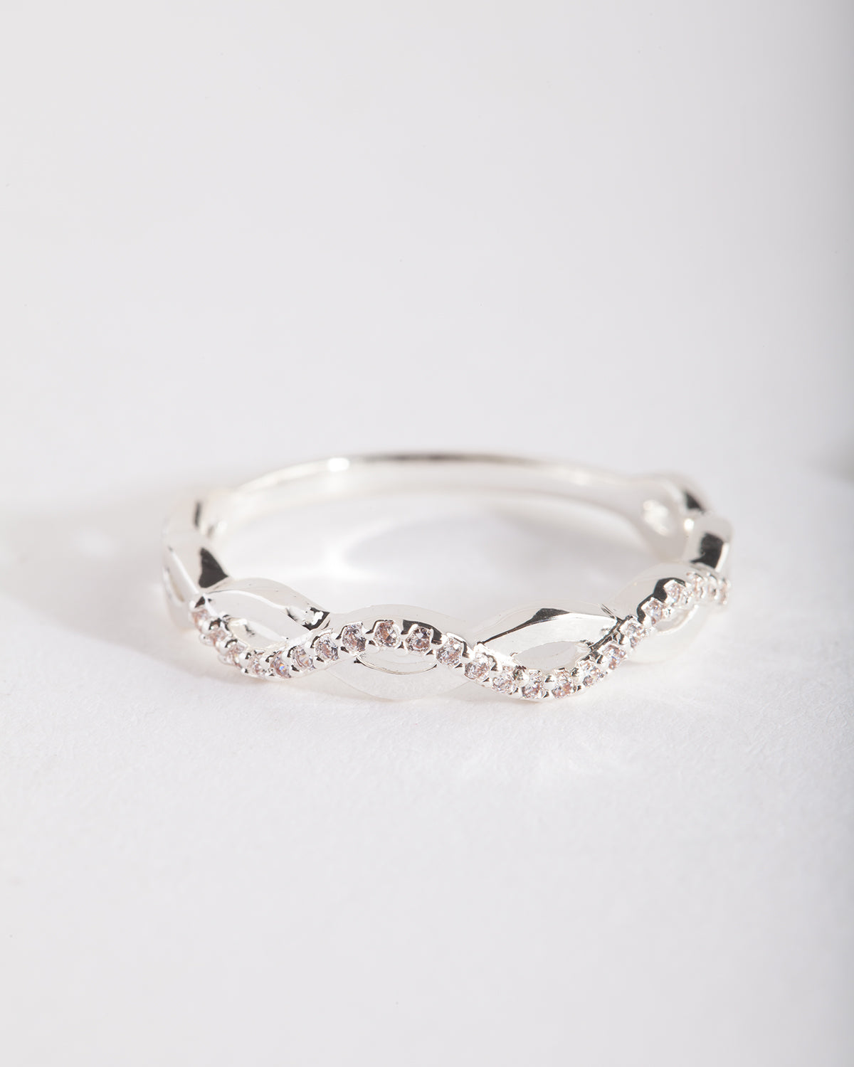This silver-tone rope ring boasts a twisted design with half adorned with cubic zirconias. This is perfect to layer up with other rings or to wear on its own.