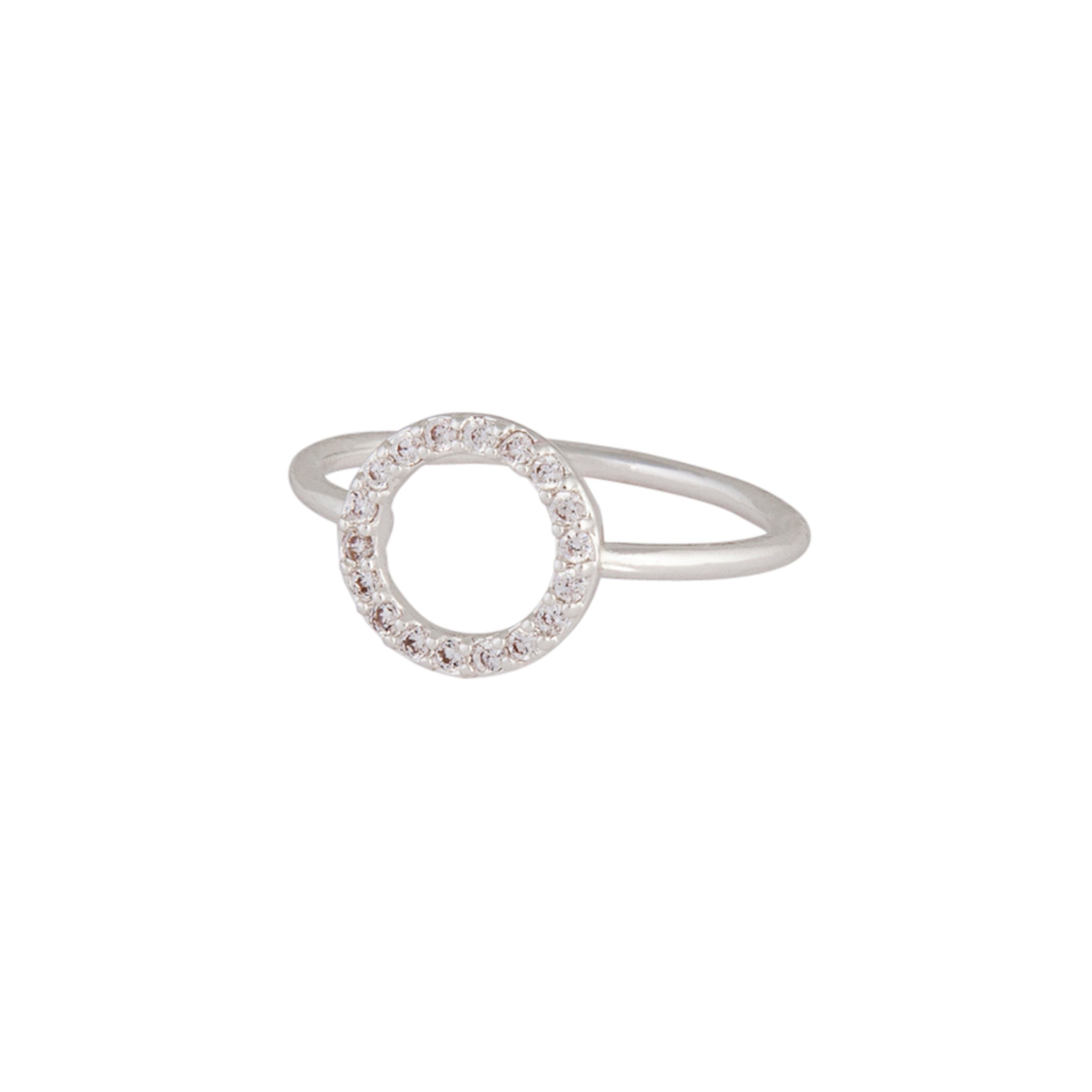 This silver-toned ring boasts an open circle design embellished with cubic zirconia crystals.