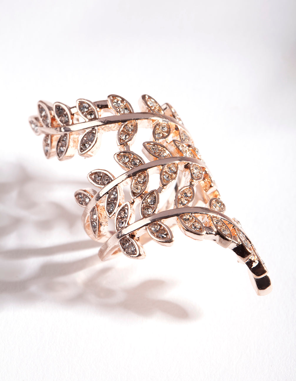 Create a glamorous look and make a statement with this rose-gold-toned crystal leaf wrap ring.