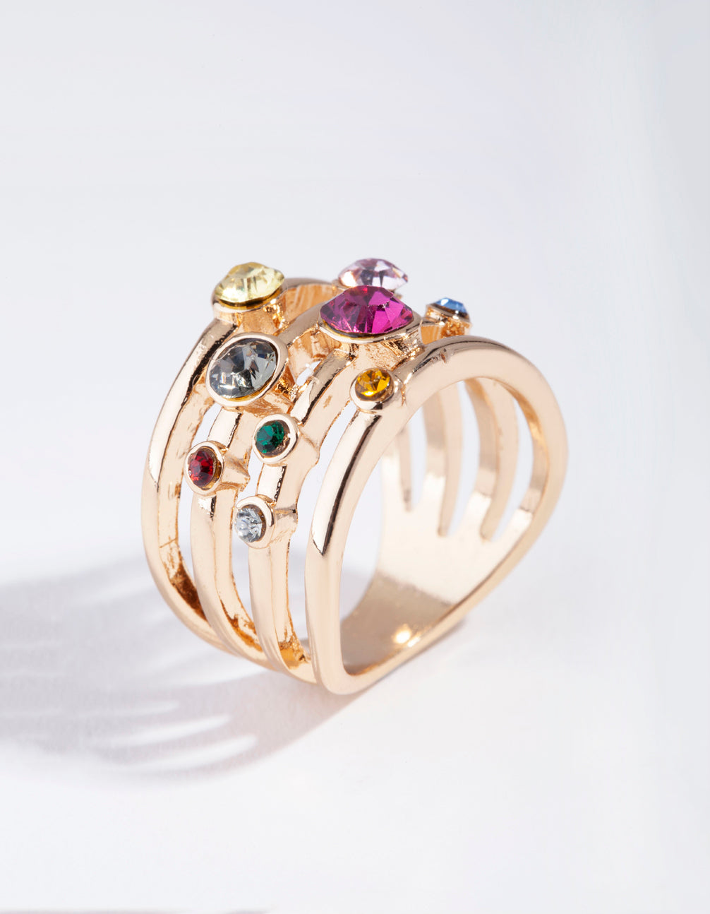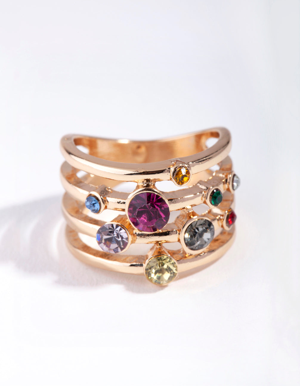 Step into summer with playful rings with major 90s vibes Ð perfect for festivals, summer nights or lounging poolside. This gorgeous gold-toned ring has a layered effect as itÕs comprised of four thinner bands (giving off the effect of wearing several rings instead of one!). It will sparkle when it hits the light as itÕs encrusted with multi-coloured diamantes for maximum shine. Stack it with other retro-inspired rings for a fun and funky look!