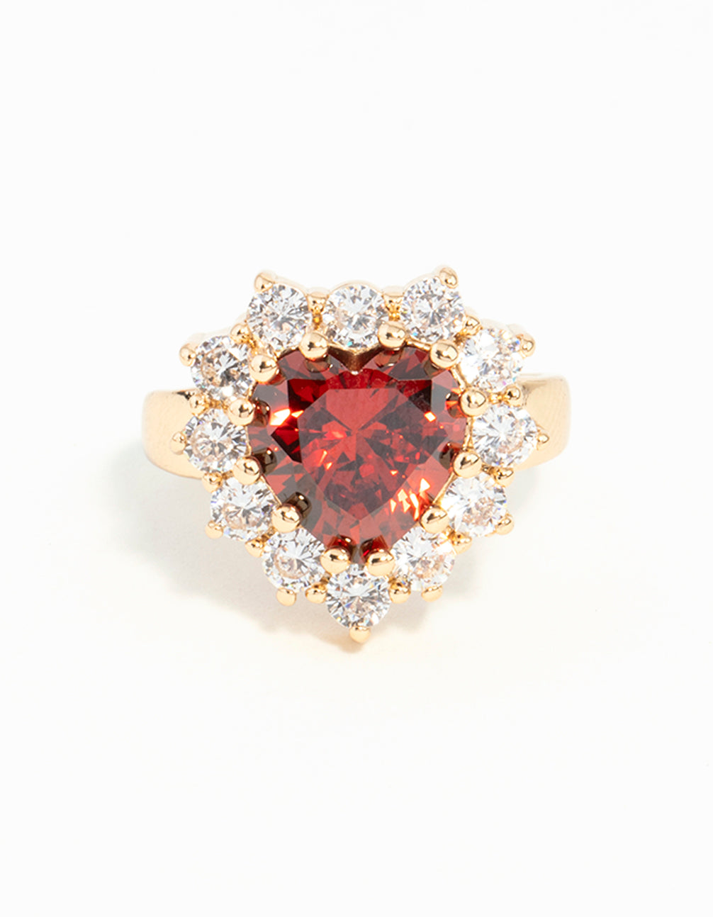 Make a statement with a stunning fashion ring! This ring features a gold-toned setting with a ruby-red, heart-shaped embellishment that's boarded by diamantes. Stack it with other styles for extra impact, or wear it alone for a refined addition to your ensemble.