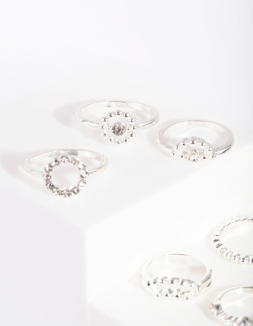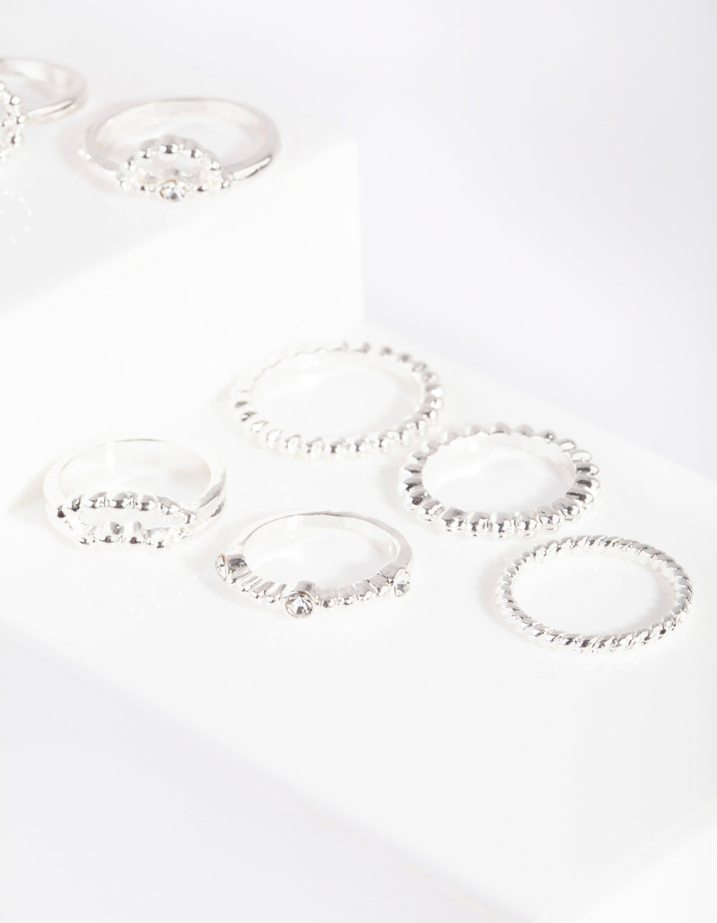 Mix and match with our ring packs! Stackable rings allow you to create your own personalised looks. This pack comes with a variety of silver-toned styles with diamante dot band designs.
