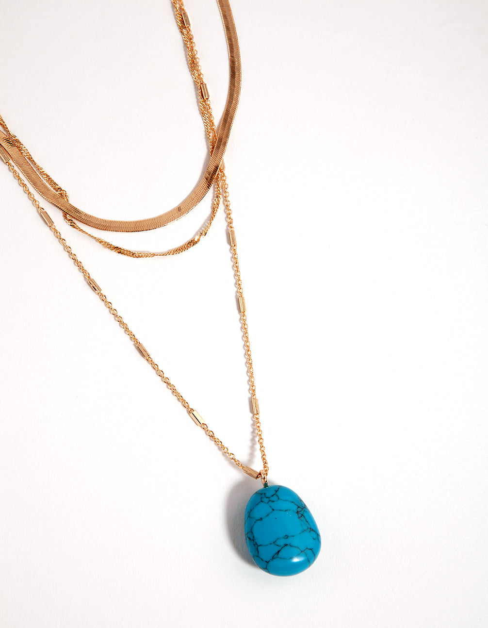 Discover the Semi-Precious Collection, featuring curated jewellery with semi-precious stone elements made to balance and restore. This gorgeous gold-toned necklace features three different chains to create a layered look, and has a large turquoise stone to add some colour. Turquoise is a protective stone that helps to prevent negative energy, and itÕs said to bring peace and good fortune to its owner!