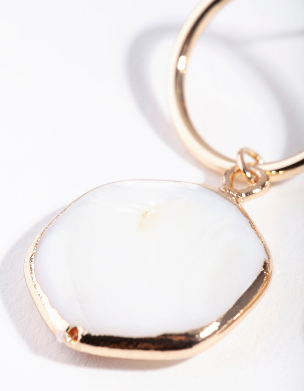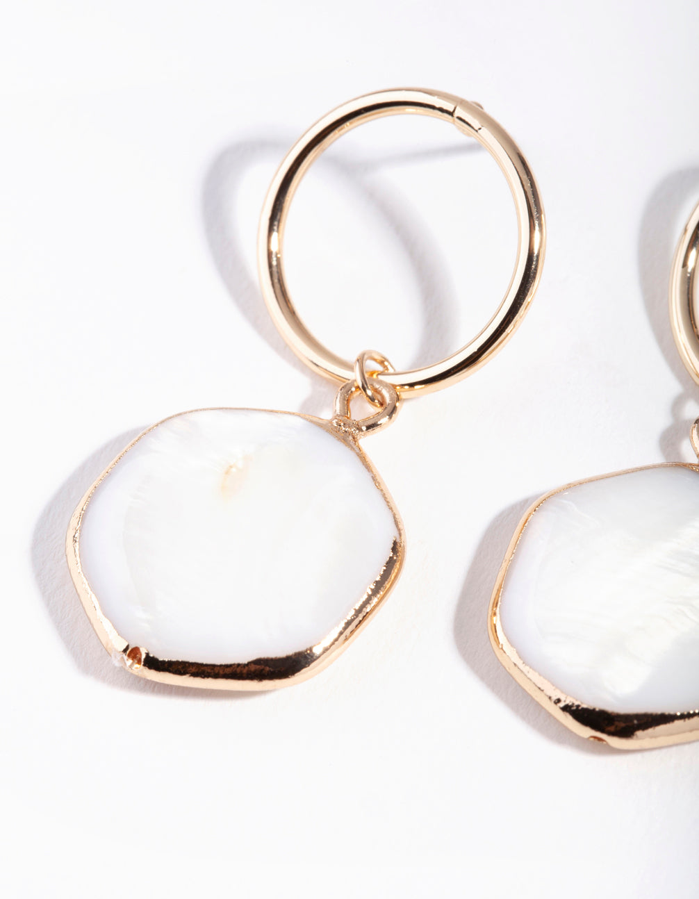 These lovely earrings are gold toned, and boast a hexagon-shaped, hanging detail with shell elements.
