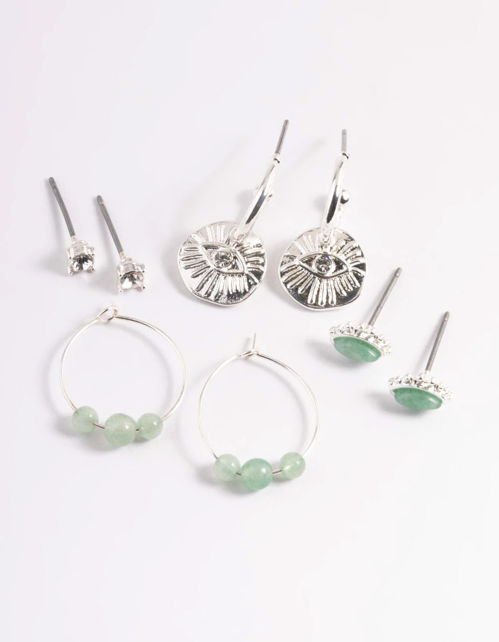 Silver Green Fluorite Evil Diamante Stick Earrings