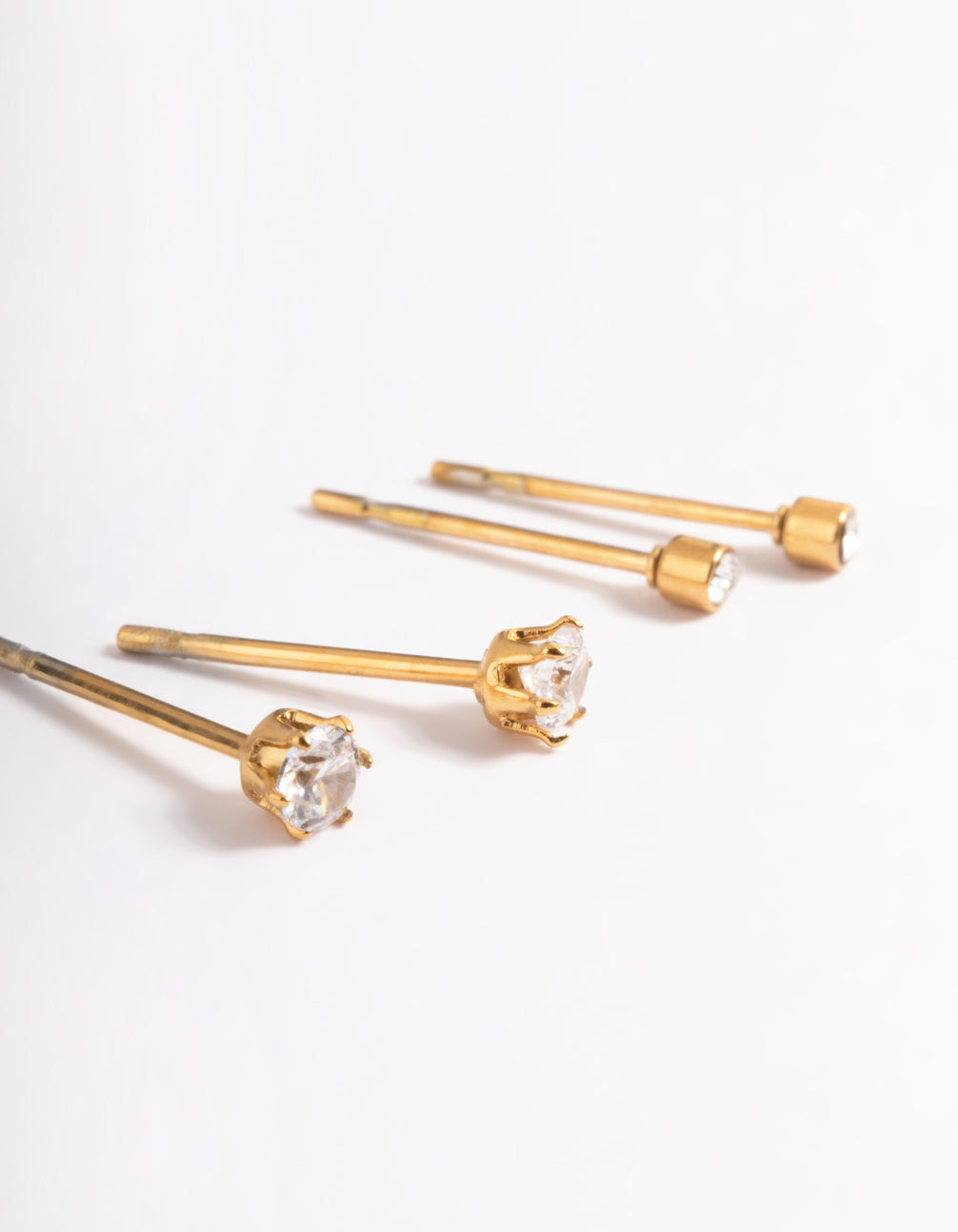 Waterproof Gold Plated Stainless Steel Cubic Zirconia Plain Stud Earrings Pack