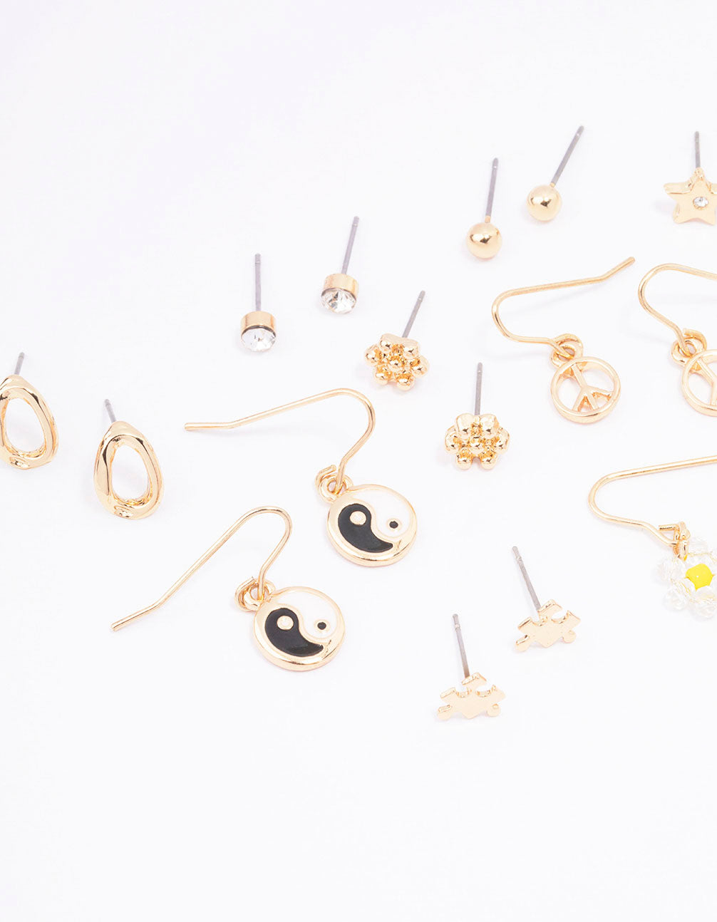 - This earring pack contains 12 pairs of gold hoop and stud earrings adorned with a collection of puzzle piece and star motifs.