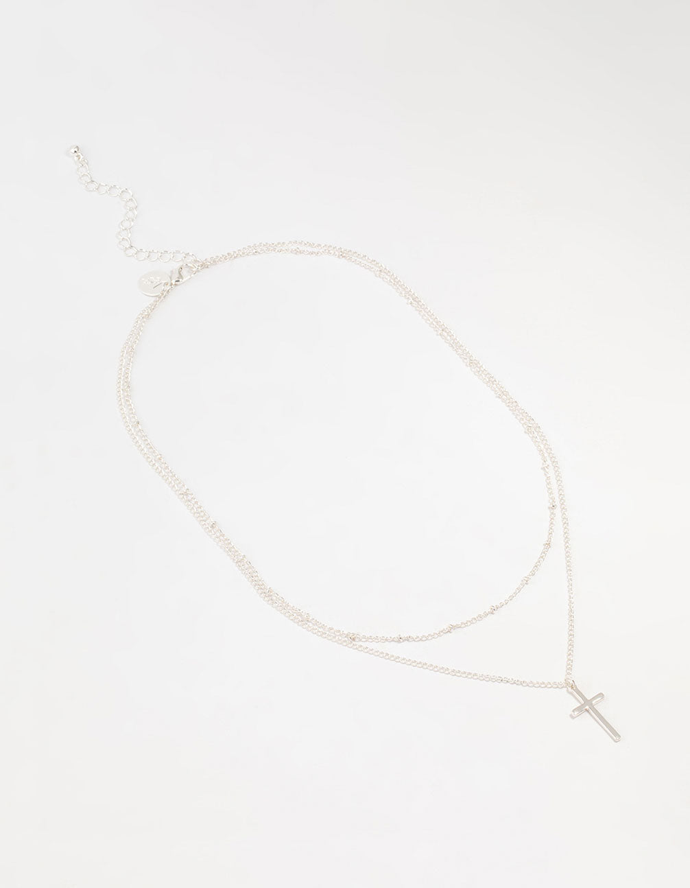 This stunning silver toned layered necklace features one cross pendant layer and one ball-and-chain layer. Perfect for an elegant touch to any ensemble.