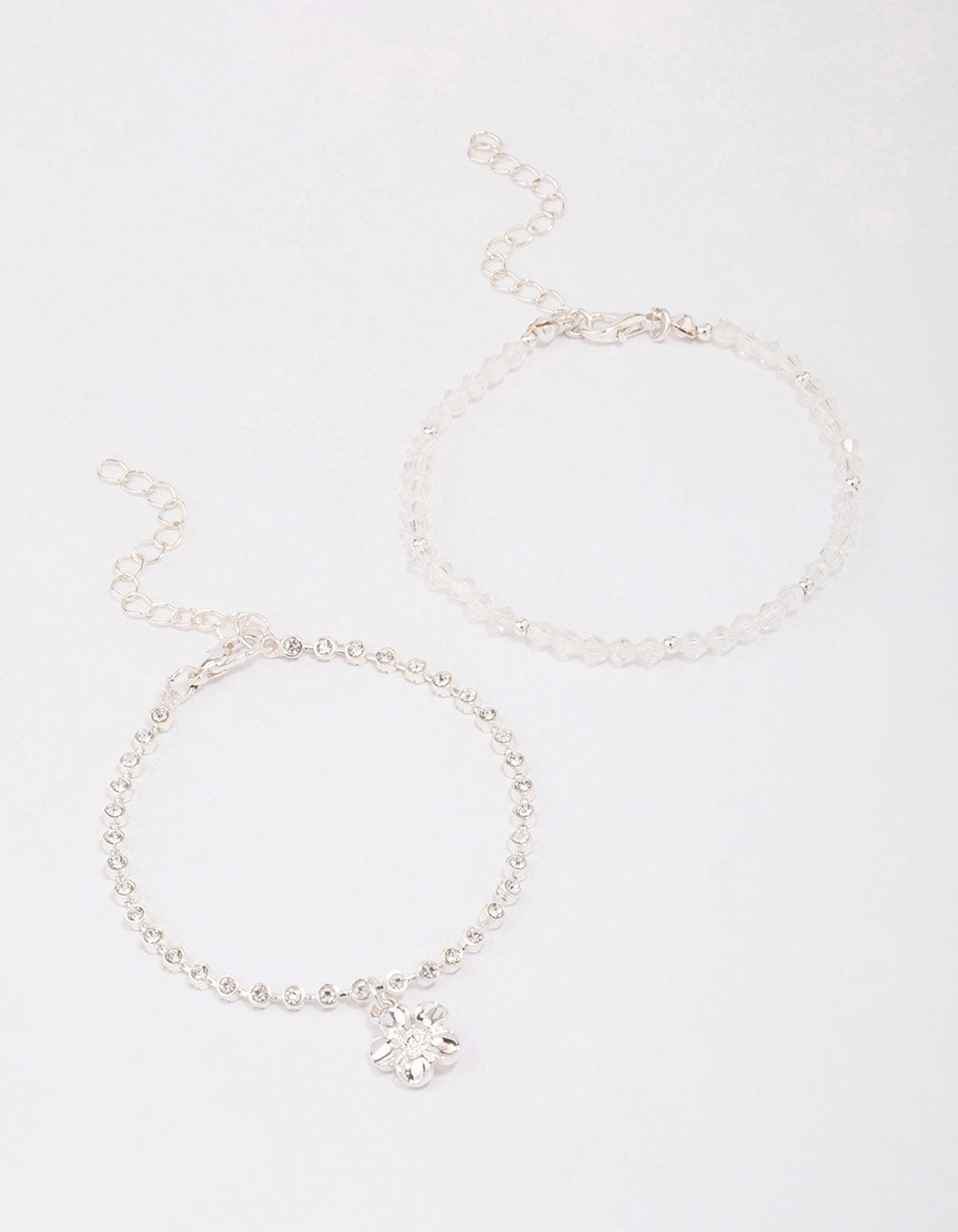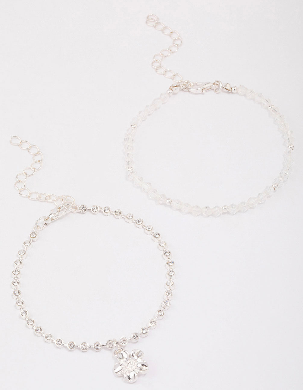 Silver Beaded Diamante Flower Charm Bracelet Pack