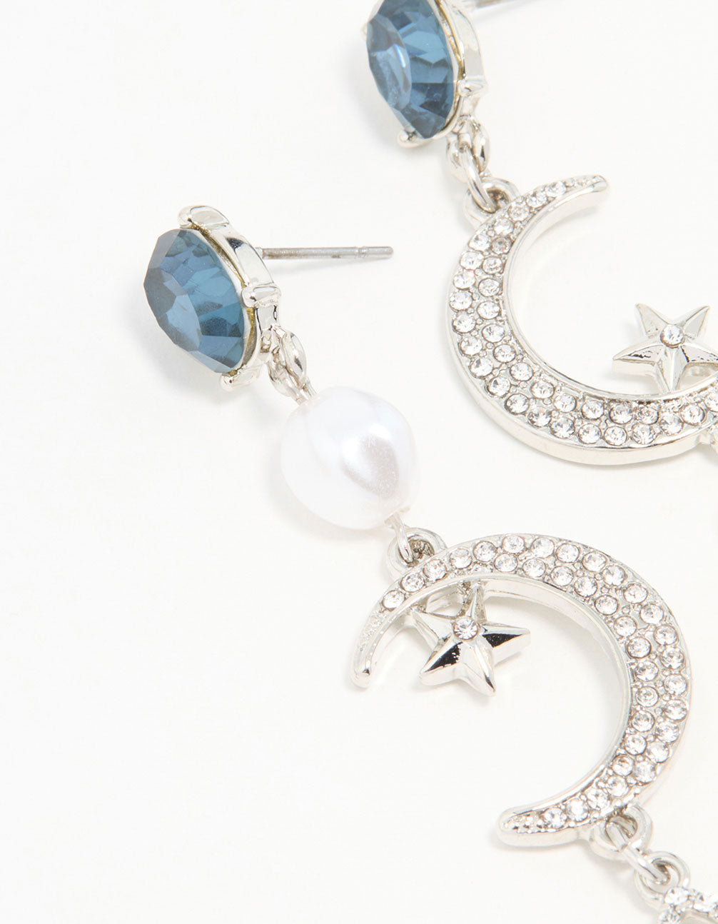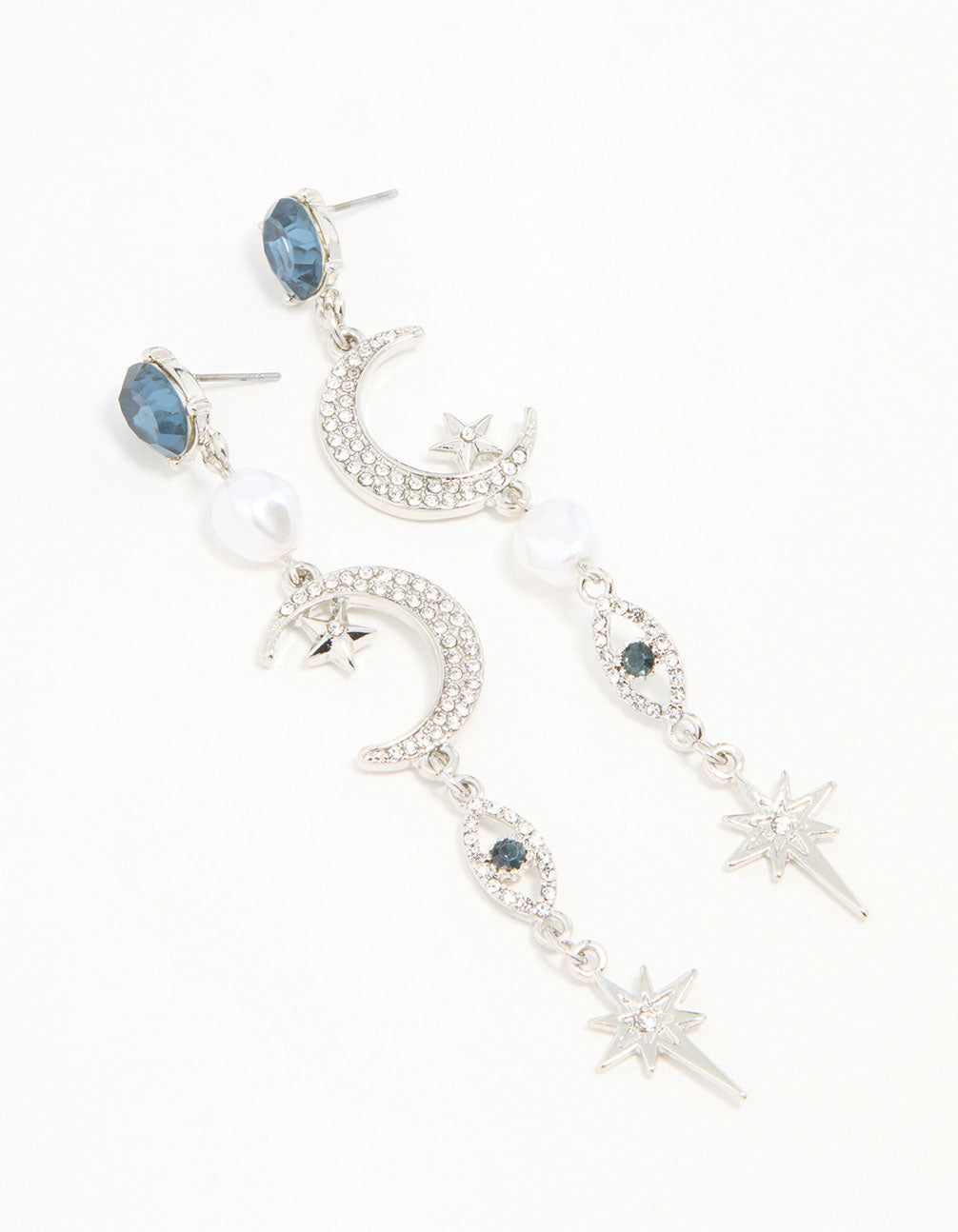 Dive into dreamy vibes with these Silver Blue Diamante Celestial Drop Earrings! These stunning celestial motif drop earrings feature a silver-toned finish and sparkling blue diamantes.