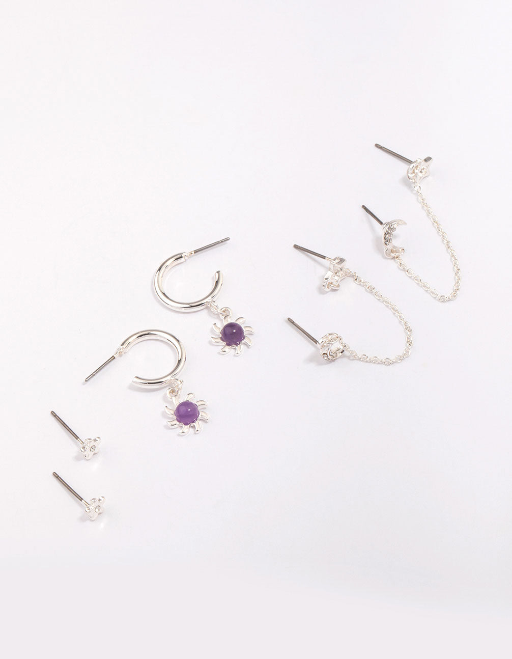 Curate the stack of your dreams with this earring pack! This set of stacking earrings contains two sets of studs and one pair of hoop earrings, each adorned with amethyst stones for a pop of colour.