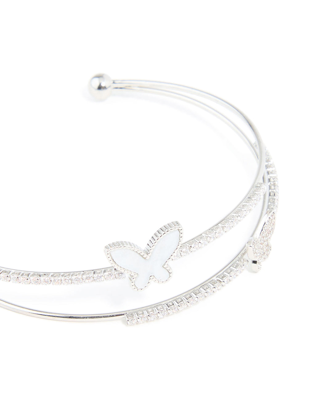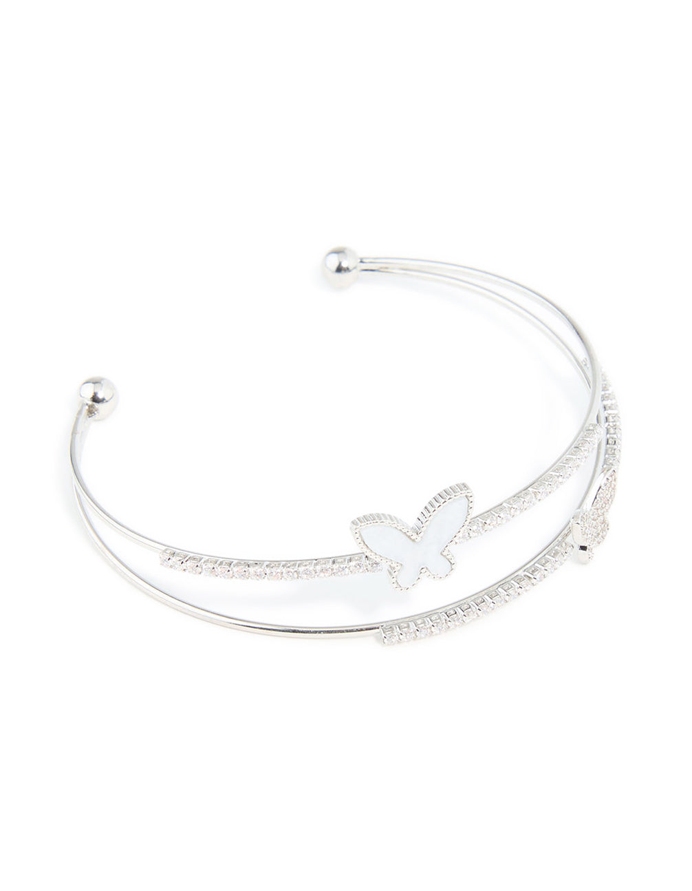 Elevate your style with this Silver Cubic Zirconia Butterfly Wrist Cuff. Crafted from sleek silver, this gorgeous wrist cuff features delicate butterfly designs adorned with sparkling cubic zirconia crystals, adding a dash of brilliance to any outfit. The cuff's open design makes it easy to wear, offering a sophisticated yet youthful vibe that suits both casual and formal occasions. Perfect for pairing with flowy dresses, tailored blazers, or evening gowns, this accessory is a versatile must-have for anyone who loves to add a little shimmer to their look. Whether you’re heading to a party, a wedding, or a brunch with friends, this butterfly wrist cuff is the ideal finishing touch for effortless style.