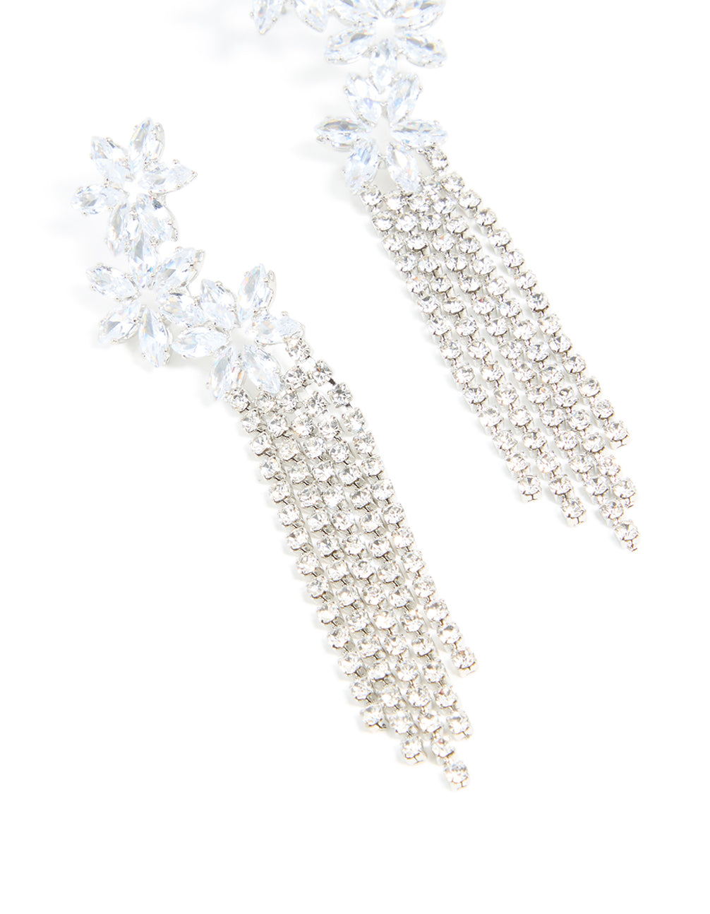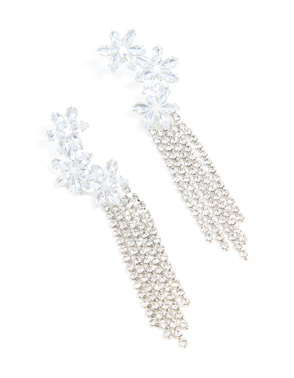 Silver Cubic Zirconia Flower Cupchain Drop Earrings