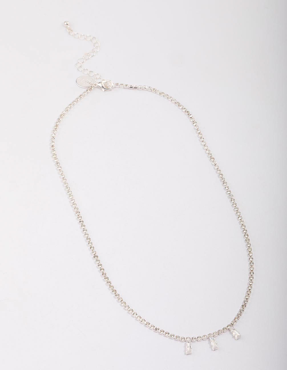 For a modern addition to your stack, style this simple silver chain. This chain necklace features a trio of baguette-cut crystals, perfect for adding a timeless touch to your outfit.