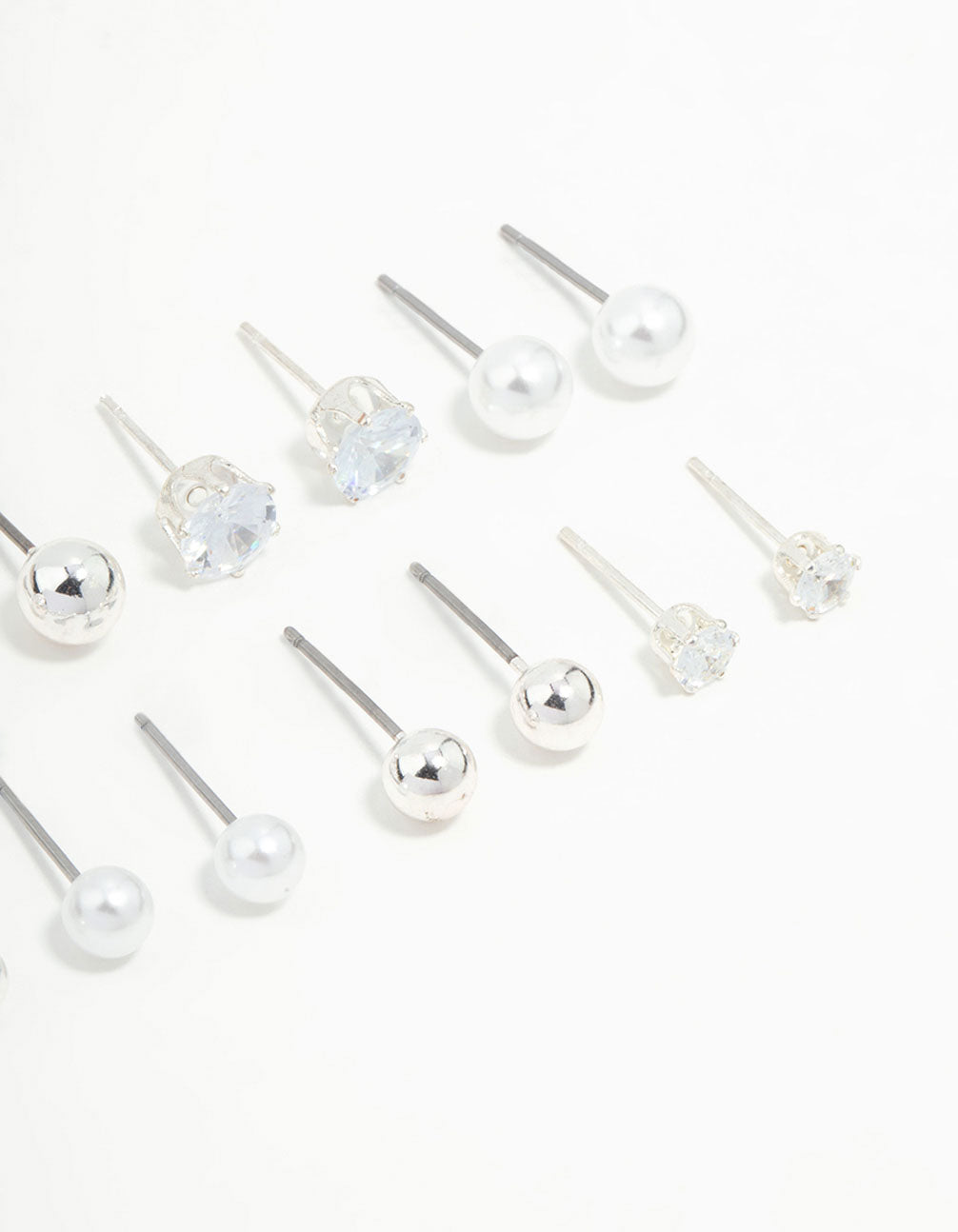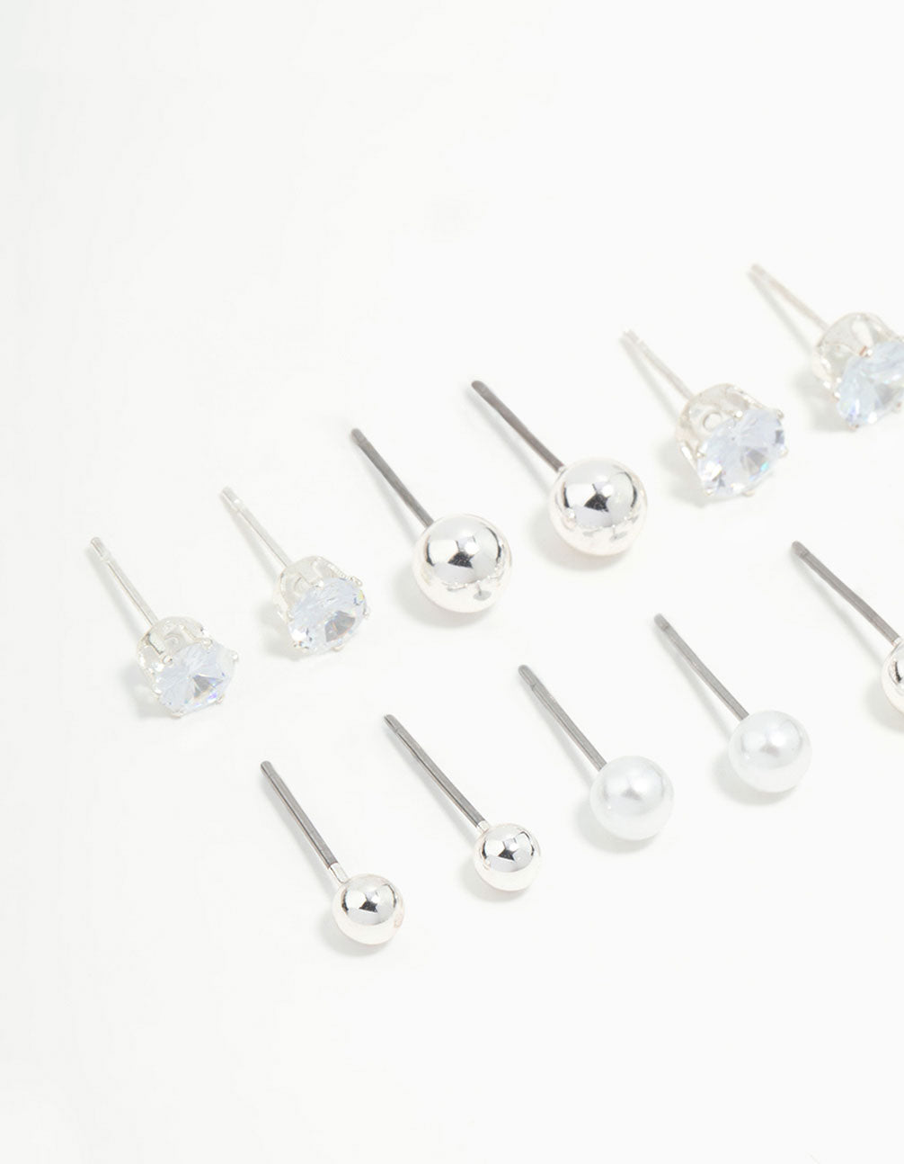 Silver Diamante & Pearl Stud Earrings 8-Pack
