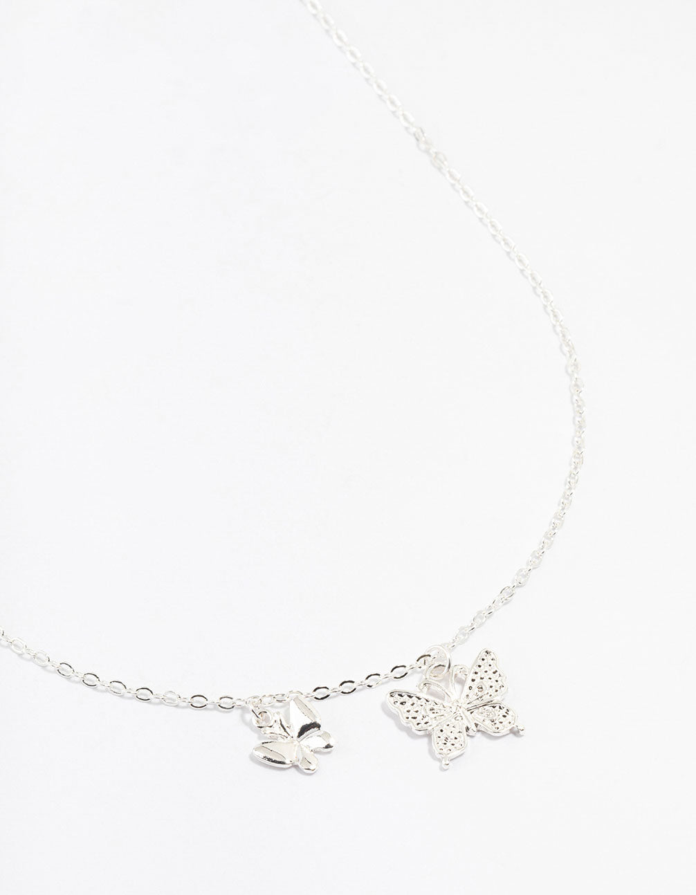Chic butterfly motifs are timeless. Elevate your style with the Silver Double Diamante Butterfly necklace for a subtle yet playful touch. The shiny silver finish complements various outfits and other necklaces perfectly.