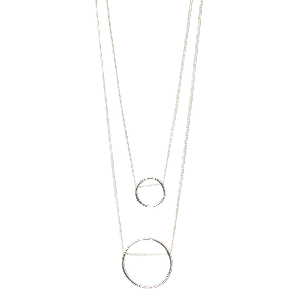 This silver-toned necklace boasts two circle pendants in a layered style.