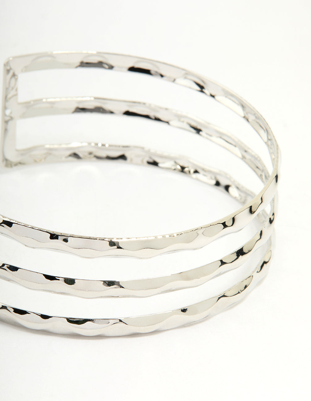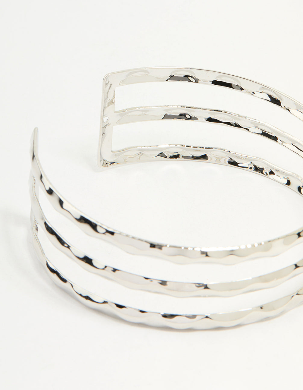 Turn heads with this Silver Hammered Layered Arm Cuff. Featuring a layered three-row design and a textured hammered finish, this arm cuff offers a modern yet timeless vibe. Crafted with a sleek silver-tone metal, it's perfect for adding a statement touch to your outfit. Whether you're dressing up for a festival, a summer party, or just looking to add a bit of flair to your everyday style, this versatile accessory is your go-to. Pair it with sleeveless tops or flowy dresses to show off its bold design, or layer it with other wristwear for a chic stacked effect. Stylish, youthful, and effortlessly cool, this arm cuff is all about making your look unforgettable.