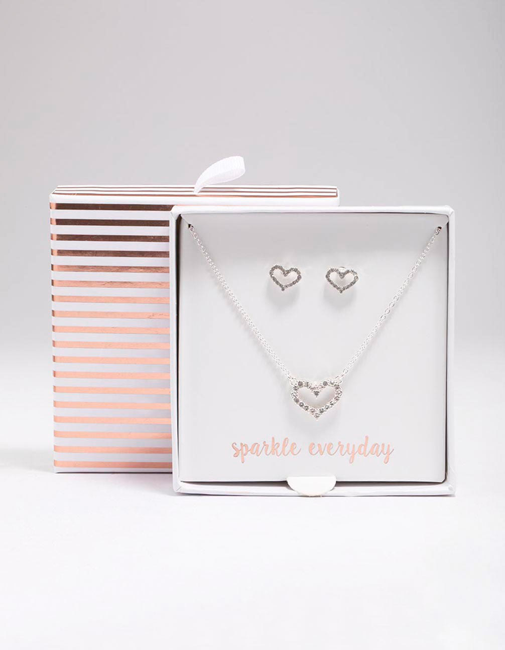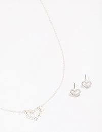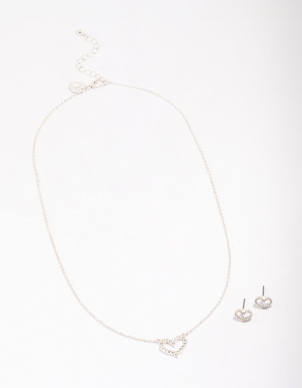 Complete your outfit with this silver-toned jewellery set. This matching set contains a dainty pendant necklace and pair of adorning stud earrings, both designed with heart-shaped outlines for a lovable touch.