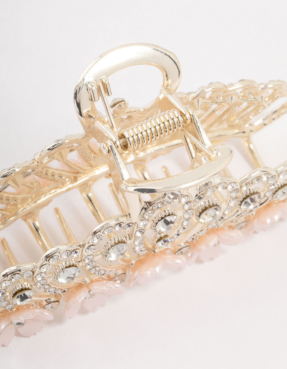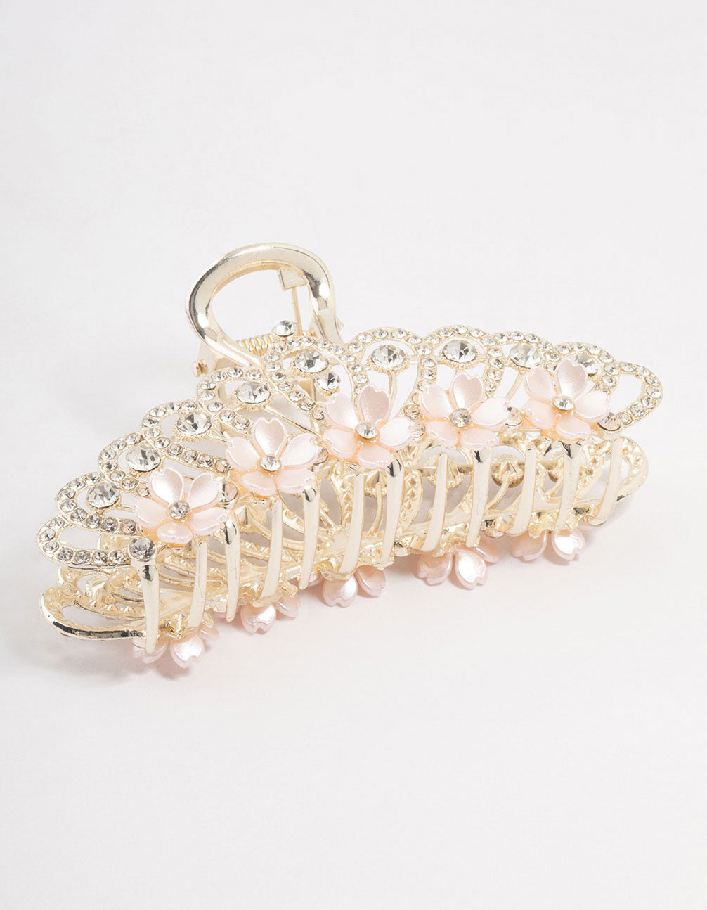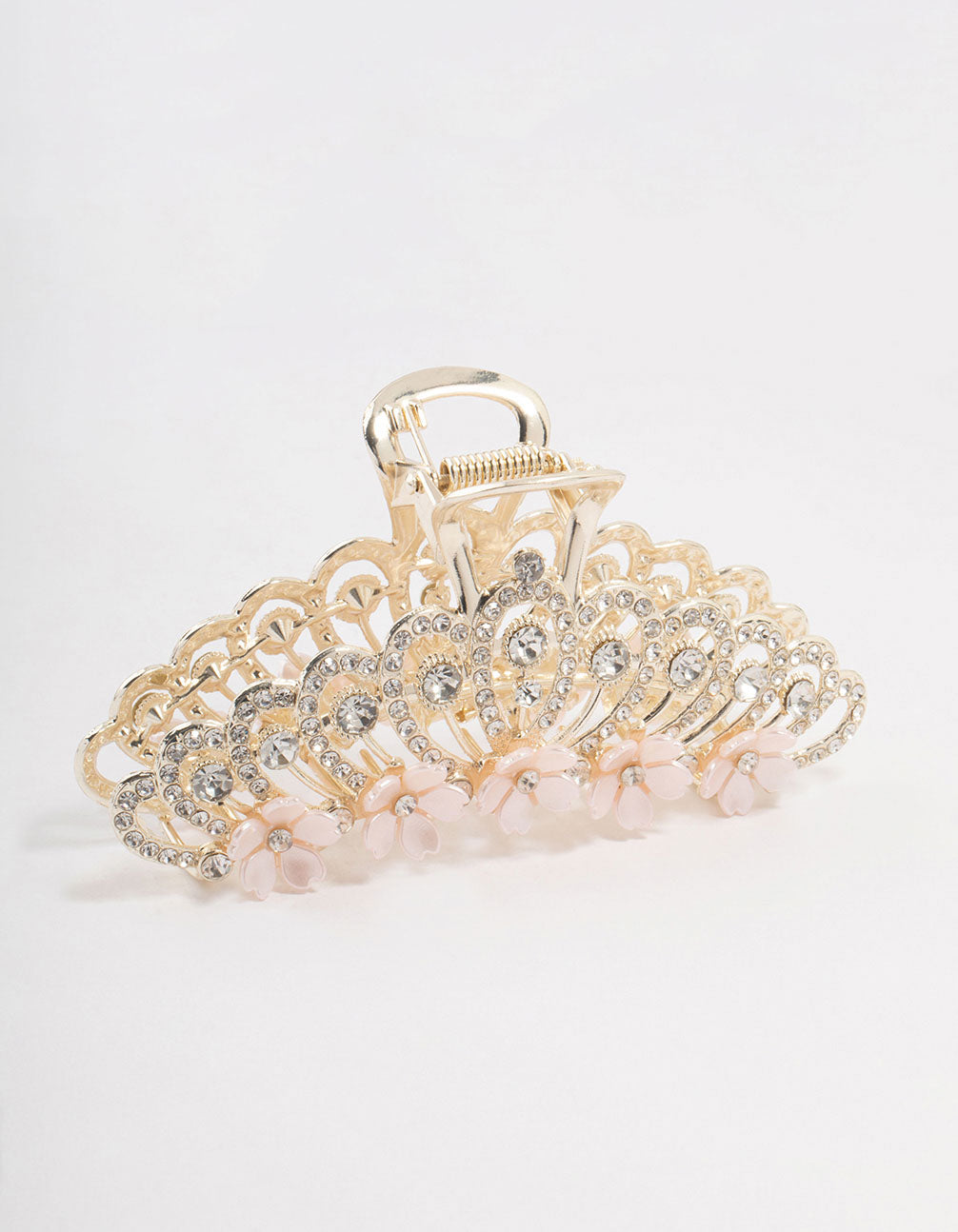 Elevate your bridal look with this diamante and flower claw clip – a sleek, regal accessory crafted from luxurious silver. Shaped like a crown and adorned with dazzling crystals and flow motifs, it makes a bold statement with effortless glamour.